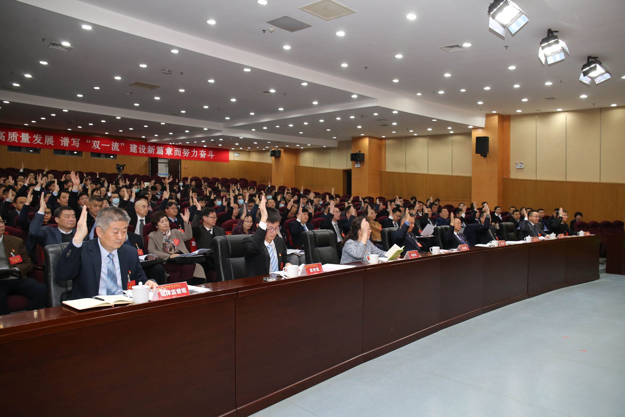隨后召開了大會主席團第一次會議。主席團全體成員表決通過了大會執(zhí)行主席名單,大會副秘書長、秘書處工作機構設置及各工作組組長、副組長名單,特邀嘉賓、列席人員名單(書面),大會日程(書面),《大會選舉辦法(草案)》,預選監(jiān)票人、總監(jiān)票人名單,正式選舉監(jiān)票人、總監(jiān)票人名單,預選和大會選舉計票人、總計票人名單,醞釀提出第三屆“兩委”候選人建議名單,審議通過了《關于黨費收繳、使用和管理情況的報告(草案)》。