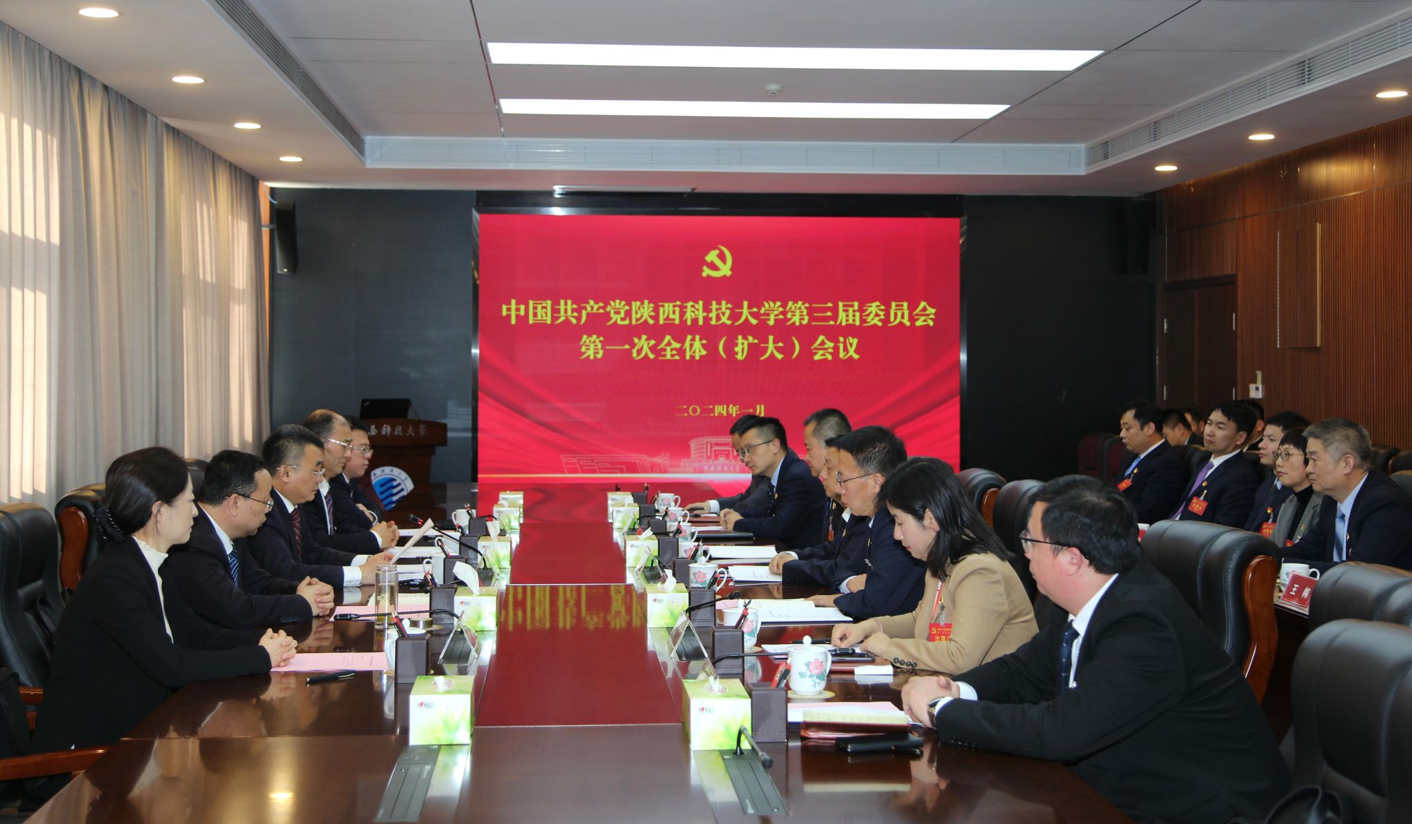 1月11日下午,中國共產黨陜西科技大學第三屆委員會第一次全體(擴大)會議在逸夫樓506會議室舉行。會議選舉了中國共產黨陜西科技大學第三屆委員會書記、副書記,審查并通過了中國共產黨陜西科技大學第三屆紀律檢查委員會第一次全體會議關于紀委書記、副書記的選舉結果。