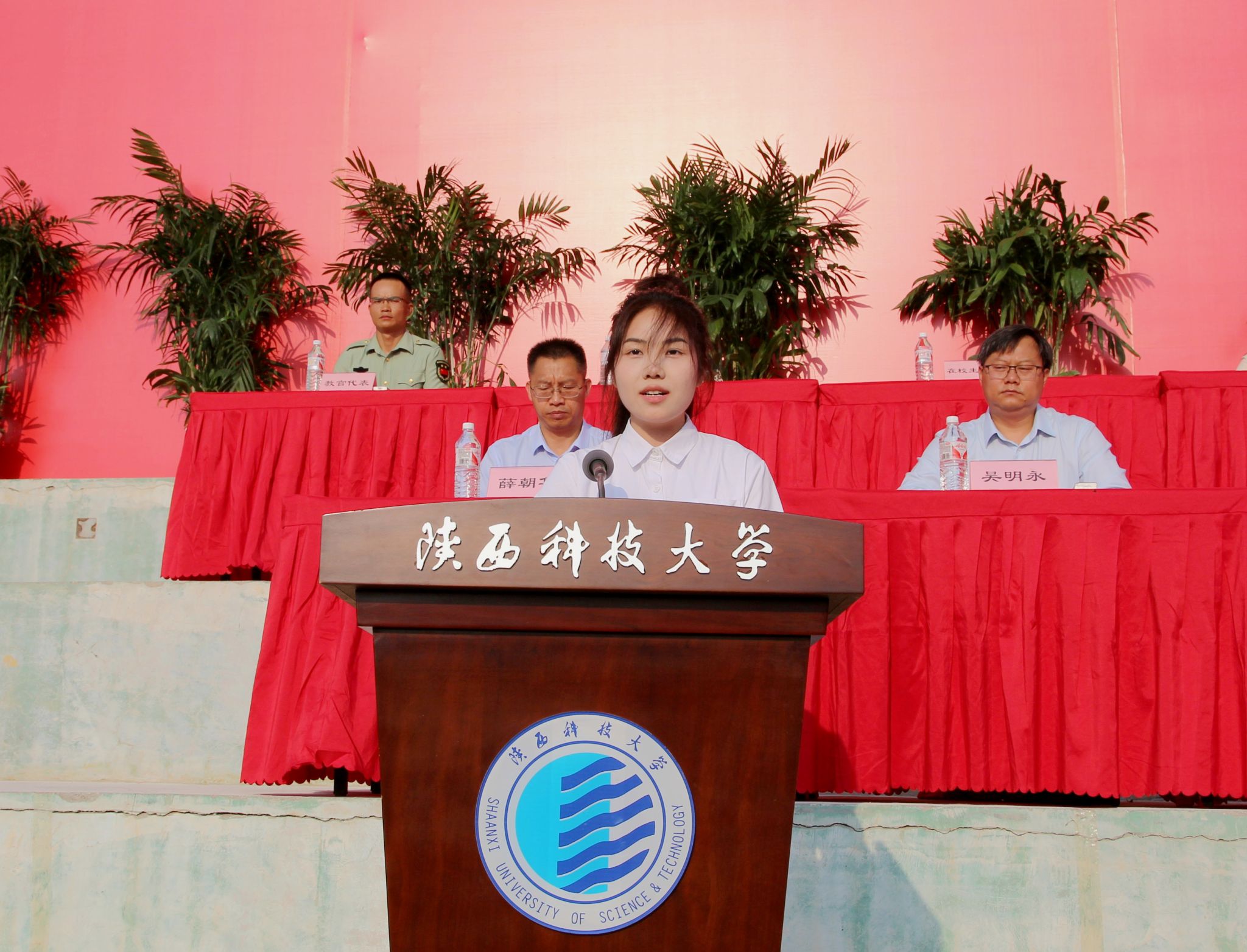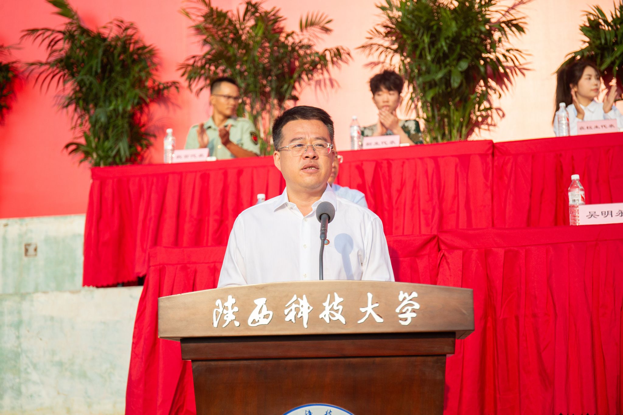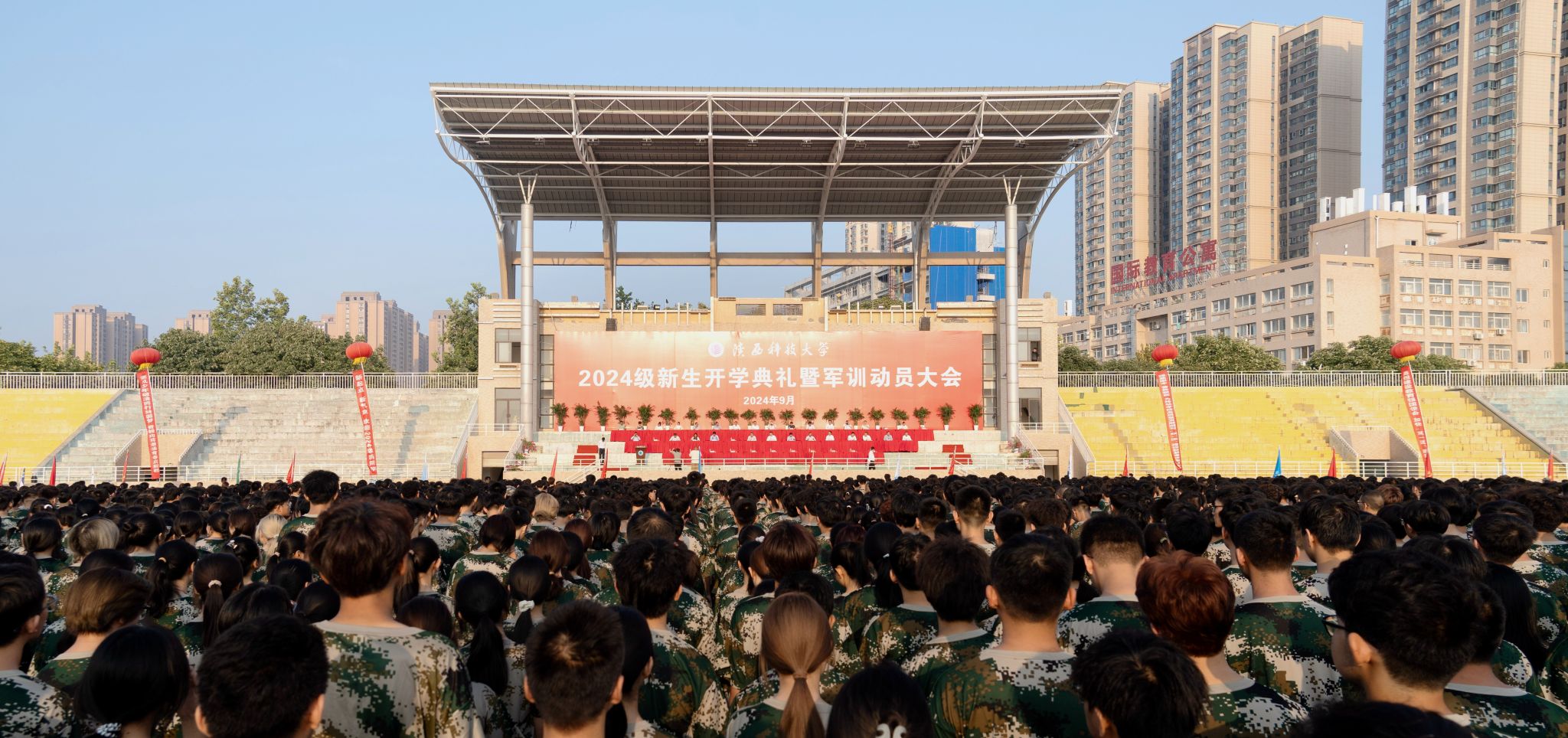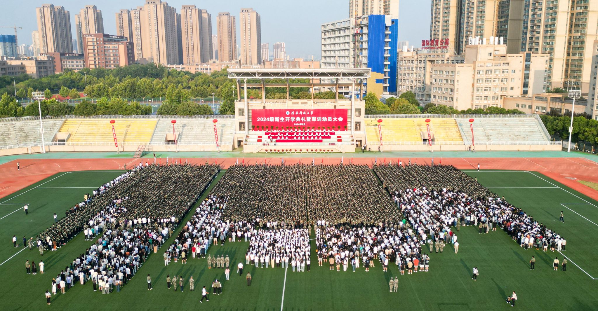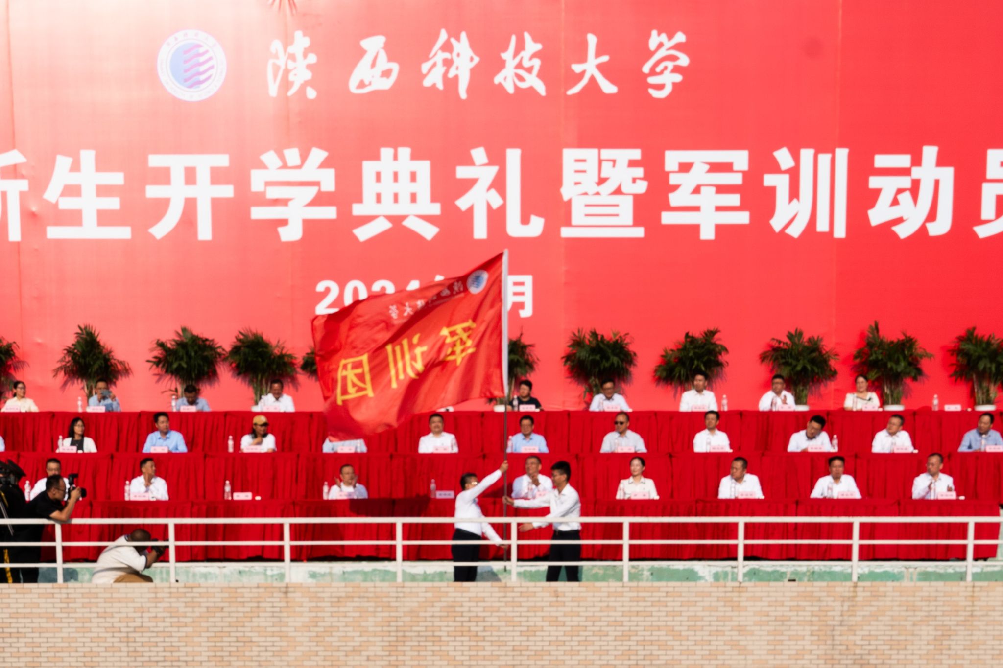 9月4日上午,我校2024級(jí)新生開(kāi)學(xué)典禮暨軍訓(xùn)動(dòng)員大會(huì)在標(biāo)準(zhǔn)田徑場(chǎng)舉行。校黨委書記樊建武,校長(zhǎng)李志健,校黨委副書記王道安,校黨委副書記、紀(jì)委書記、監(jiān)察專員羅瑩,校黨委副書記李學(xué)軍,副校長(zhǎng)黃劍鋒、蒲永平、費(fèi)貴強(qiáng)、黃海峙、陸趙情及各部門、各學(xué)院主要負(fù)責(zé)人、師生代表出席典禮。樊建武為2024年軍訓(xùn)團(tuán)頒授軍訓(xùn)團(tuán)團(tuán)旗,李志健發(fā)表講話。校黨委副書記郭強(qiáng)主持典禮。