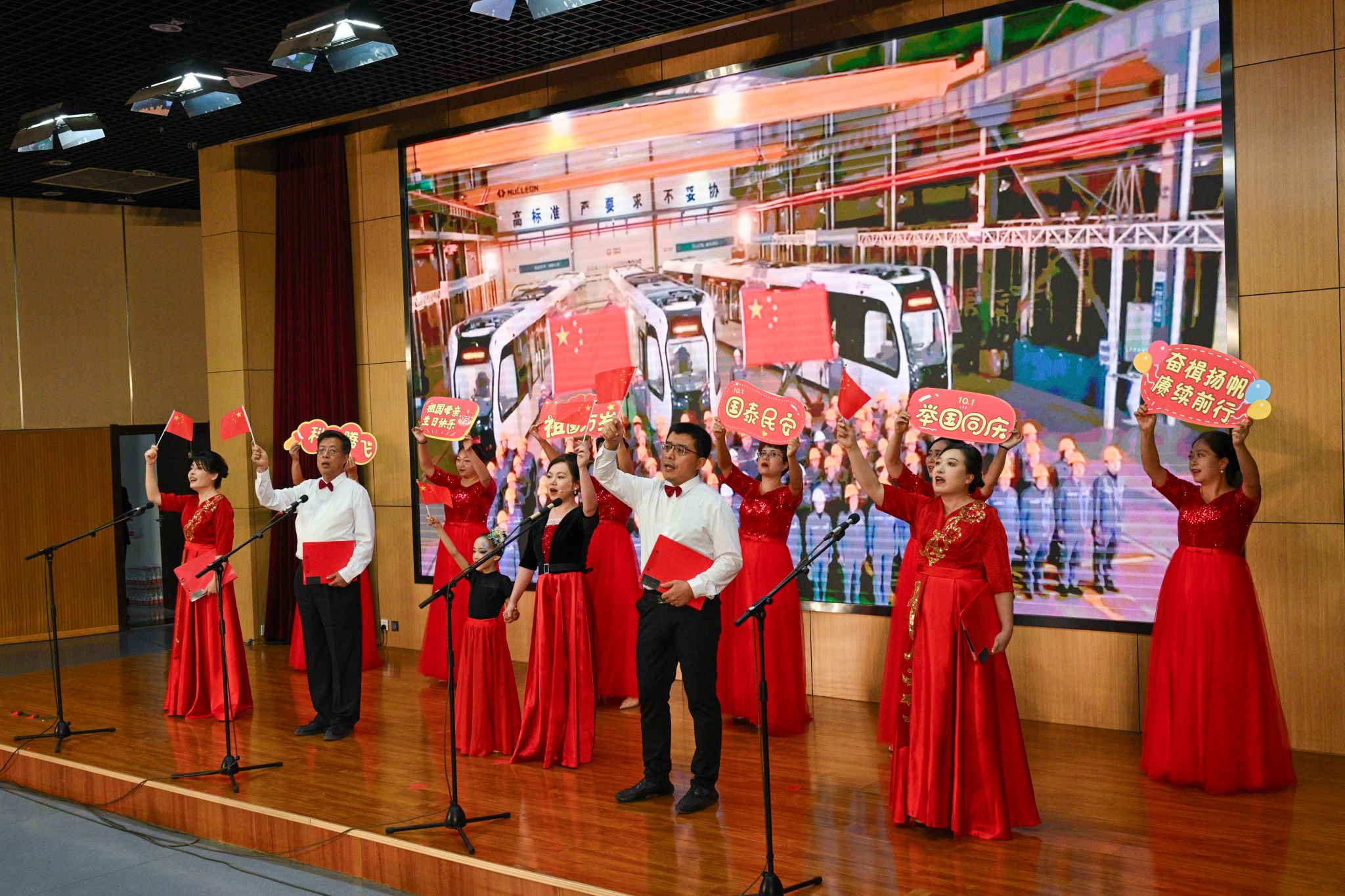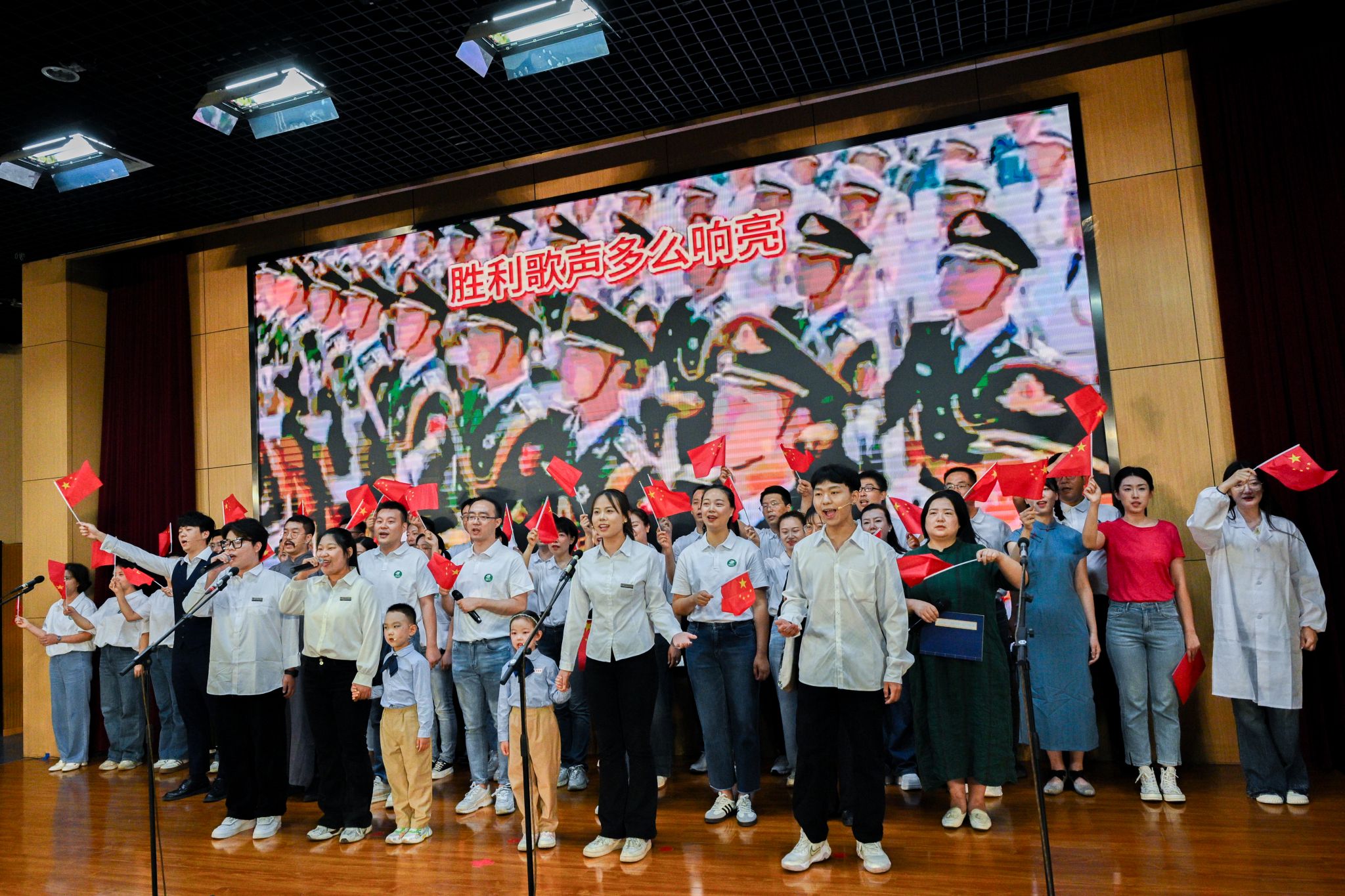 “五星紅旗迎風飄揚,勝利歌聲多么響亮”,在蒲公英幼兒園小朋友、校藝術團大學生的領唱下,演職人員隨著音樂揮動手中紅旗,全場觀眾們自發(fā)起立,臺上臺下齊聲合唱《歌唱祖國》,朗誦會在嘹亮的歌聲中落下帷幕。