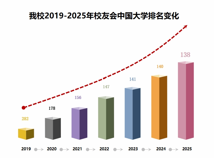 1月6日,艾瑞深中國校友會網(wǎng)發(fā)布校友會2025中國大學排名榜單,我校綜合排名位居全國第138位,實現(xiàn)六連升。標志著我校在第三次黨代會確立的“三步走”復興期建設中邁出了堅實步伐,彰顯了學校近年來各項事業(yè)的蓬勃發(fā)展。