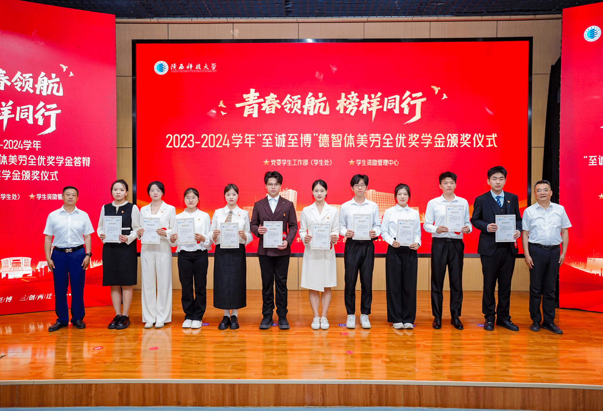 5月27日,陜西科技大學(xué)2023—2024學(xué)年“至誠至博”德智體美勞全優(yōu)獎(jiǎng)學(xué)金答辯暨國家獎(jiǎng)學(xué)金頒獎(jiǎng)儀式在圖書館學(xué)術(shù)報(bào)告廳舉行。黨委書記樊建武、校長黃劍鋒、黨委副書記李學(xué)軍出席活動(dòng),為10名“至誠至博”全優(yōu)獎(jiǎng)學(xué)金獲得者和62名國家獎(jiǎng)學(xué)金獲得者頒獎(jiǎng)。