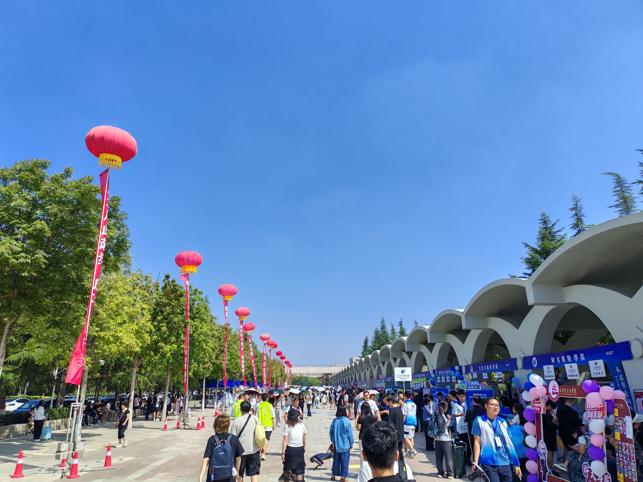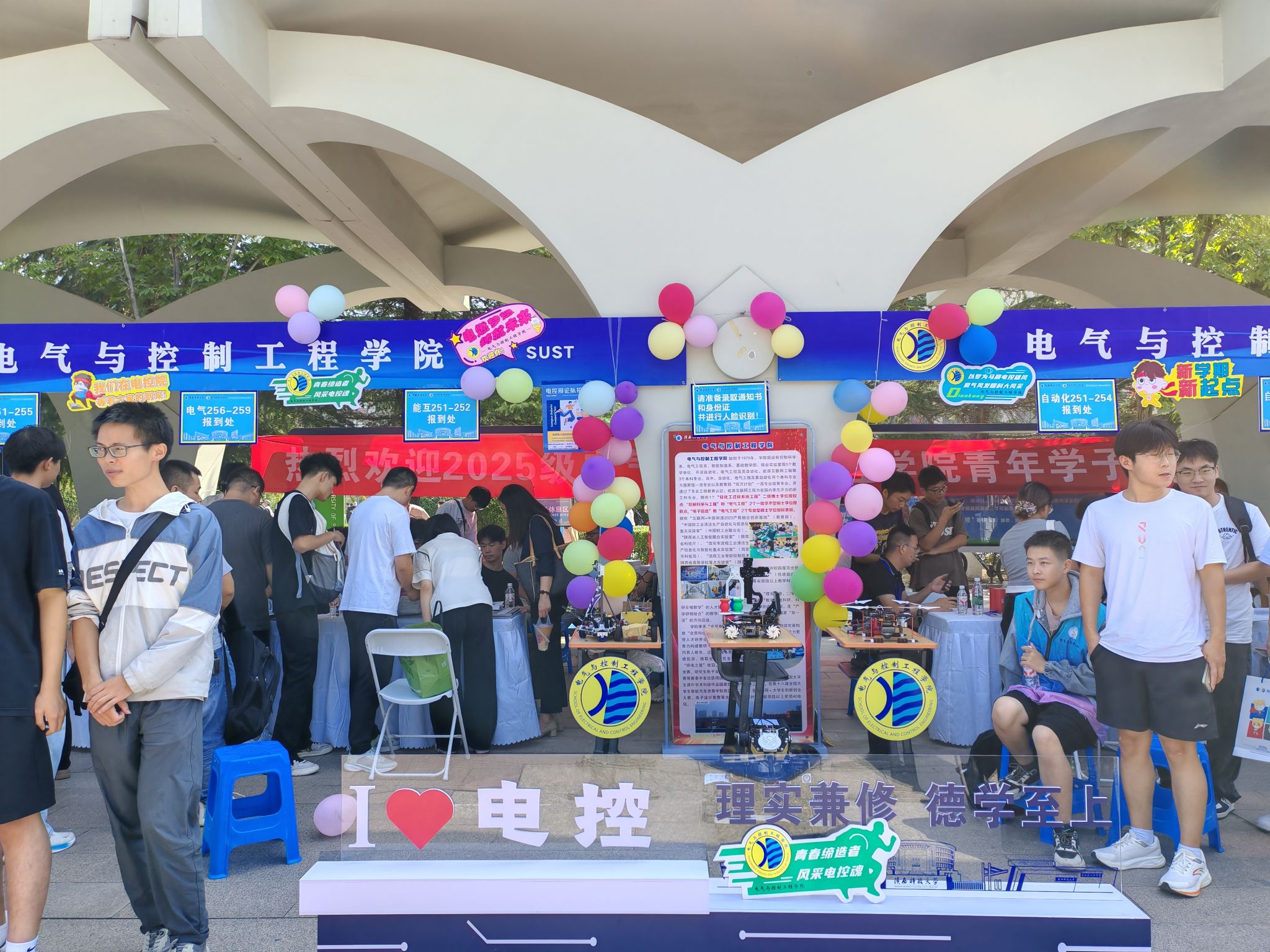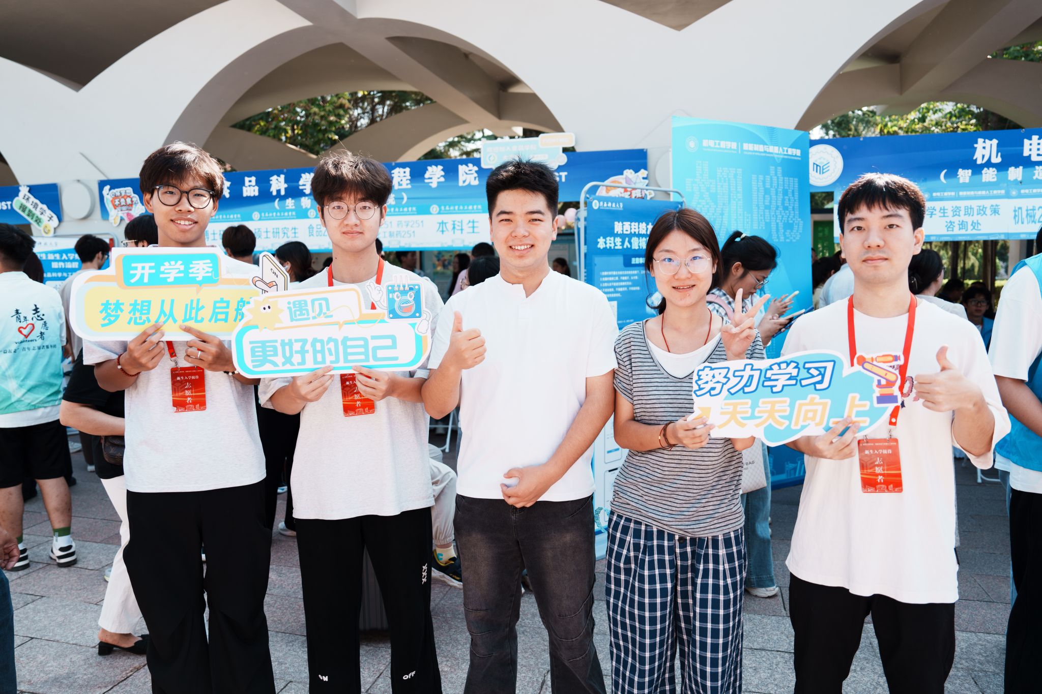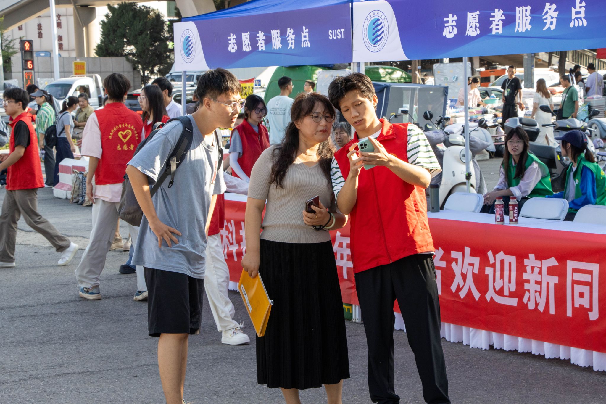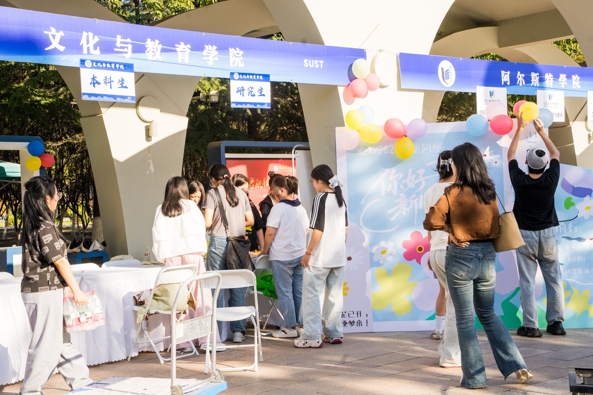 校園內(nèi),1800余名迎新志愿者身著統(tǒng)一文化衫,在車站、地鐵站及校內(nèi)100余個(gè)崗位提供“一對(duì)一”引導(dǎo)服務(wù),協(xié)助新生辦理手續(xù)、答疑解惑。家長(zhǎng)服務(wù)區(qū)內(nèi),遮陽(yáng)棚、座椅及免費(fèi)飲品一應(yīng)俱全,讓等候的家長(zhǎng)倍感貼心。迎新展板講述著學(xué)校歷史榮光,社團(tuán)集章、文藝演出、文創(chuàng)展示等活動(dòng)吸引新生踴躍參與,“自主性強(qiáng)、參與度高”的氛圍助力新生快速融入校園。