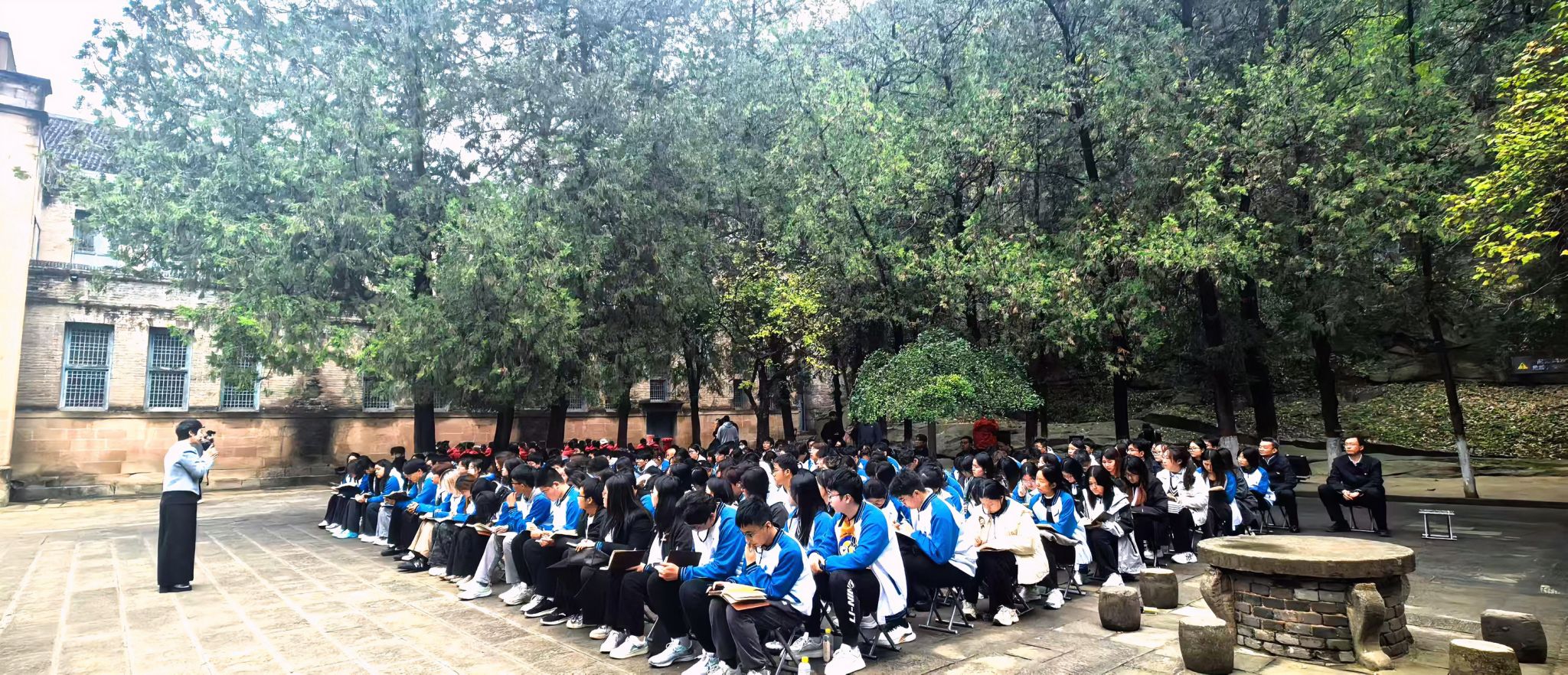 在去往延安的路上,研學(xué)團(tuán)精心打造“車(chē)廂課堂”,馬克思主義學(xué)院“紅色基因·薪火傳承”研究生宣講團(tuán)開(kāi)展主題宣講,各車(chē)輛學(xué)員自發(fā)開(kāi)展紅歌傳唱,營(yíng)造出濃厚的學(xué)習(xí)氛圍。研學(xué)團(tuán)先后走進(jìn)延安革命紀(jì)念館、棗園革命舊址和為人民服務(wù)廣場(chǎng)等,觀看實(shí)景演出《延安延安》與主題電影《阿良的長(zhǎng)征》。在張思德烈士雕塑前,延安干部學(xué)院講師安治國(guó)為全體師生做主題宣講,研學(xué)團(tuán)成員集體誦讀《為人民服務(wù)》全文。師生們通過(guò)實(shí)地參觀、現(xiàn)場(chǎng)教學(xué)、情景體驗(yàn)等多種形式,在行走中感悟歷史,在思考中砥礪初心。