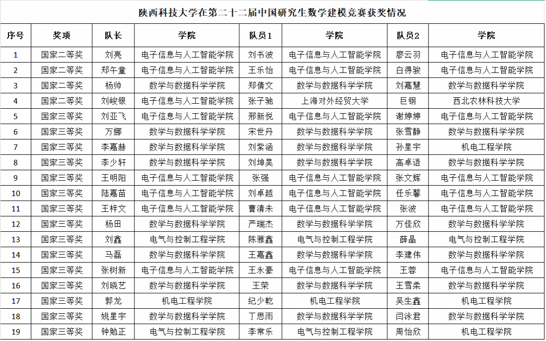 近日,“華為杯”第二十二屆中國(guó)研究生數(shù)學(xué)建模競(jìng)賽比賽成績(jī)公示,陜西科技大學(xué)研究生表現(xiàn)優(yōu)異,榮獲國(guó)家二等獎(jiǎng)4項(xiàng),國(guó)家三等獎(jiǎng)15項(xiàng),獲獎(jiǎng)數(shù)量穩(wěn)定提升,充分展現(xiàn)了我校研究生創(chuàng)新實(shí)踐能力與綜合素養(yǎng)。