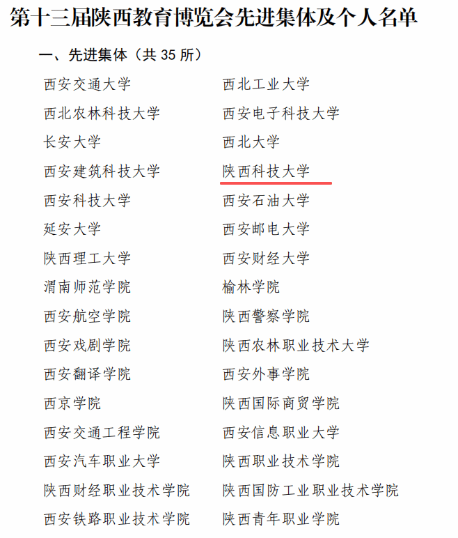 近日,陜西教育博覽會組委會發(fā)布《陜西教育博覽會組委會關(guān)于表彰第十三屆陜西高等教育博覽會先進(jìn)集體和個(gè)人的通報(bào)》文件,陜西科技大學(xué)獲評“先進(jìn)集體”。