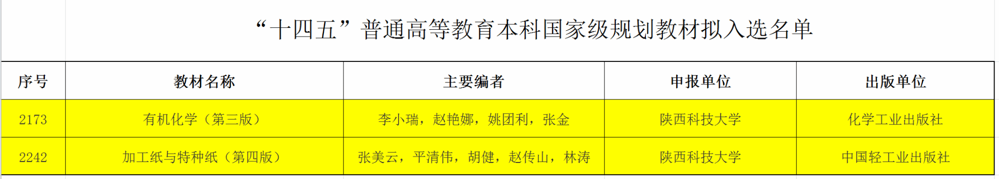 近日,教育部公示“十四五”普通高等教育本科國(guó)家級(jí)規(guī)劃教材入選名單,陜西科技大學(xué)張美云教授主編的《加工紙與特種紙》、李小瑞教授主編的《有機(jī)化學(xué)》成功入選,這是我校近年來(lái)國(guó)家級(jí)教材建設(shè)的首次突破,是業(yè)內(nèi)對(duì)我校教材建設(shè)質(zhì)量與教育教學(xué)改革成效的認(rèn)可。