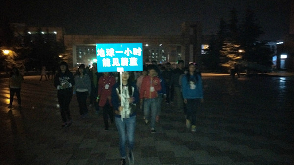 3月28日晚上的8點(diǎn)30分,周末安靜的校園里突然熱鬧起來,154名大學(xué)生伴隨著地球一小時熄燈倒計時的吶喊,放下手中的手機(jī),穿上舒適的跑鞋,開始圍繞校園奔跑。整整一個小時的時間里,同學(xué)們手機(jī)的屏幕關(guān)閉了、寢室的燈光熄滅了、不用的電源拔掉了……在一片黑暗當(dāng)中,大家一起仰望天空,尋找那顆最亮的星星,同時向全社會發(fā)出“能見蔚藍(lán)”的倡議:“遠(yuǎn)離污染,拒絕霧霾!用我一小時黑暗,換天空一片蔚藍(lán)!”