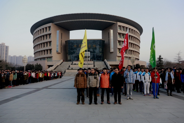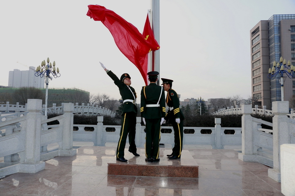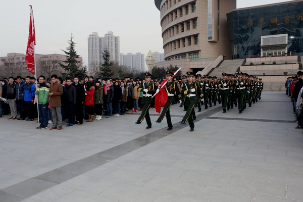 清晨,雖然已是數(shù)九寒天,但圖書館南廣場上已經(jīng)聚集了數(shù)千名前來觀禮的師生。7點(diǎn)50分,校國旗護(hù)衛(wèi)隊(duì)的隊(duì)員們?cè)谧鲎詈蟮闹b整理,雖然已經(jīng)執(zhí)行過幾十次升旗儀式,但在這個(gè)特殊的日子,他們還是感到格外緊張。7點(diǎn)55分,50名身穿禮服的國旗護(hù)衛(wèi)隊(duì)員邁著矯健的步伐走向旗臺(tái)。8點(diǎn)整,伴隨著雄壯的國歌聲和一聲“敬禮”,國旗在半空中劃出了一道美麗的弧線。在場的每一個(gè)人臉上都露出了激動(dòng)的神情。