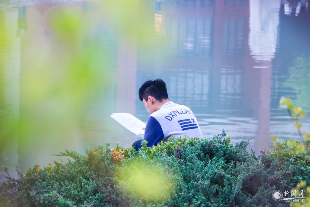 湖邊的人分為兩撥。在湖靠近化工樓一邊,排成排對著湖發(fā)出唱歌似的音調(diào)漸升悠遠綿長的“啊啊啊”聲的,是來自文傳學(xué)院播音專業(yè)的同學(xué),練習(xí)發(fā)聲是她們每天的必修課。剩下的拿著書本或站或坐地分散在湖邊的便是來參加晨讀的了。