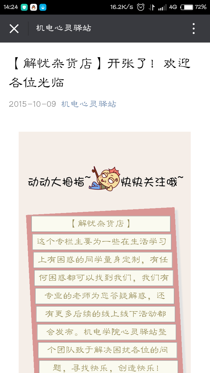 機(jī)電學(xué)院還借助“機(jī)電心靈驛站”微信公眾平臺(tái),針對新生開辟了“解憂雜貨店”專欄,為在適應(yīng)性問題上有困惑的新生同學(xué)量身定制。同學(xué)們通過網(wǎng)絡(luò)投遞的困惑都會(huì)有專業(yè)的老師一對一答疑解惑及時(shí)回復(fù),實(shí)現(xiàn)了學(xué)生與老師平等交流的雙向互動(dòng)。