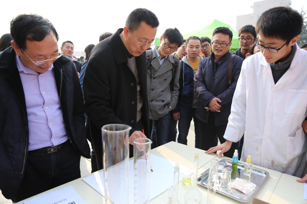 隔音型環(huán)保氣壓熱敷音樂眼罩、健身發(fā)電系統(tǒng)、紅棗打漿去核機、懶人克星時鐘、智能預警小車、空氣路由器……200余件科大學子的最新科技創(chuàng)新成果,12月7日齊刷刷亮相我校2015年大學生科技創(chuàng)新節(jié)暨大學生科技創(chuàng)新成果展開幕式。這些集體驗性、科學性、趣味性為一體的科技創(chuàng)新作品,吸引了萬余名師生駐足參觀,在全校掀起了大學生參與科技創(chuàng)新的又一熱潮。校長姚書志、校黨委副書記溫鋒親臨開幕式現(xiàn)場參觀指導。校長姚書志(左三)饒有興致地參觀了解科技創(chuàng)新作品的外觀、原理功能、實際應用等方面校黨委副書記溫鋒(左二)在利用變色反應原理的紙上題書“創(chuàng)新”兩字寄語莘莘科大學子