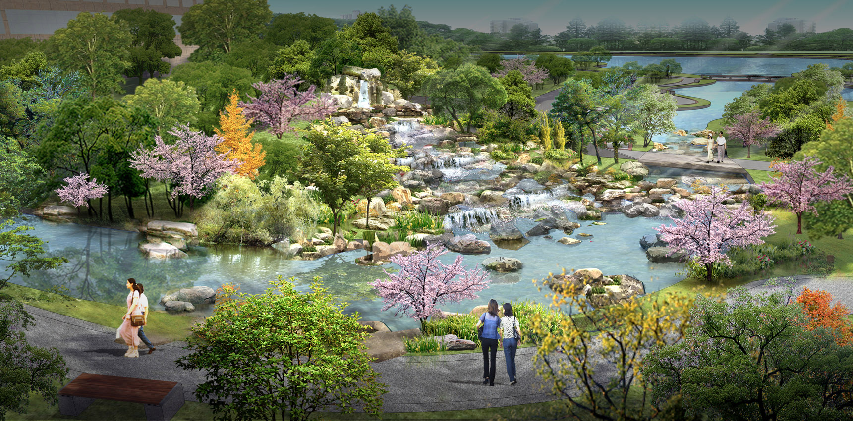 此次設(shè)計(jì)和施工的主導(dǎo)思想,是把原一期湖水環(huán)繞學(xué)校標(biāo)志性建筑圖書館一周貫通流動(dòng)起來,將水體、綠化和景觀融為一體,突出空間層次效果。人工湖貫通改造利用圖書館北側(cè)的自然坡勢(shì)和原有的假山山體,通過假山瀑布、疊水噴泉、荷花、水草等水生植物,結(jié)合棧橋、親水平臺(tái)等提升景觀效果,增加水面的空間層次。新增的園路、汀步和座椅等設(shè)施,最大限度地激發(fā)圖書館周邊空間活力,為廣大師生員工營(yíng)造一個(gè)聞天然花香、觀荷塘魚群,藍(lán)天、碧水、溪流、綠地相得益彰的學(xué)習(xí)和休閑環(huán)境。