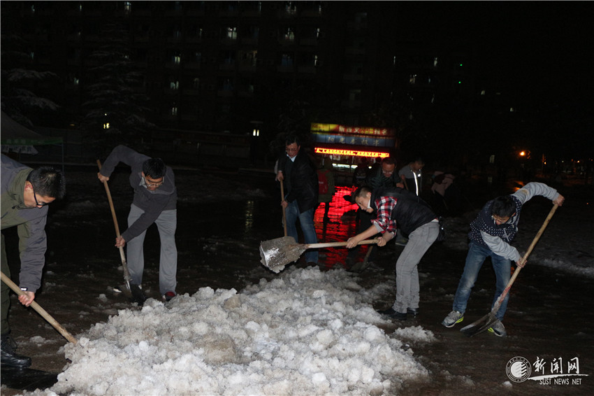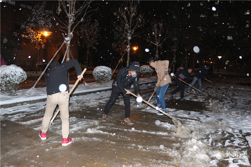當(dāng)晚,號召一經(jīng)發(fā)出,學(xué)校陽光助學(xué)中心、國旗護衛(wèi)隊、公寓自管會、易班工作站紛紛響應(yīng),建立起愛心隊伍組織鏟雪行動,黨委副書記溫鋒也親臨現(xiàn)場參與鏟雪。冬日的雪夜寒風(fēng)刺骨,志愿者們的手都凍得通紅,但他們依然精神抖擻,不言辛苦,冒著嚴寒繼續(xù)鏟雪。他們的奉獻之心感染了路過的學(xué)生們,紛紛加入到了掃雪除冰的隊伍中。從黨員到群眾,從教師到學(xué)生,所有人的愛心匯聚成熾熱跳躍的火焰,點亮,溫暖了科大寒冷的夜。師生們齊心協(xié)力讓這個雪天不再“濕滑”,切實保障了師生們的出行,保障了學(xué)校各項教學(xué)科研工作的正常進行。他們的熱心構(gòu)成了這個雪天校園中最美的風(fēng)景。
