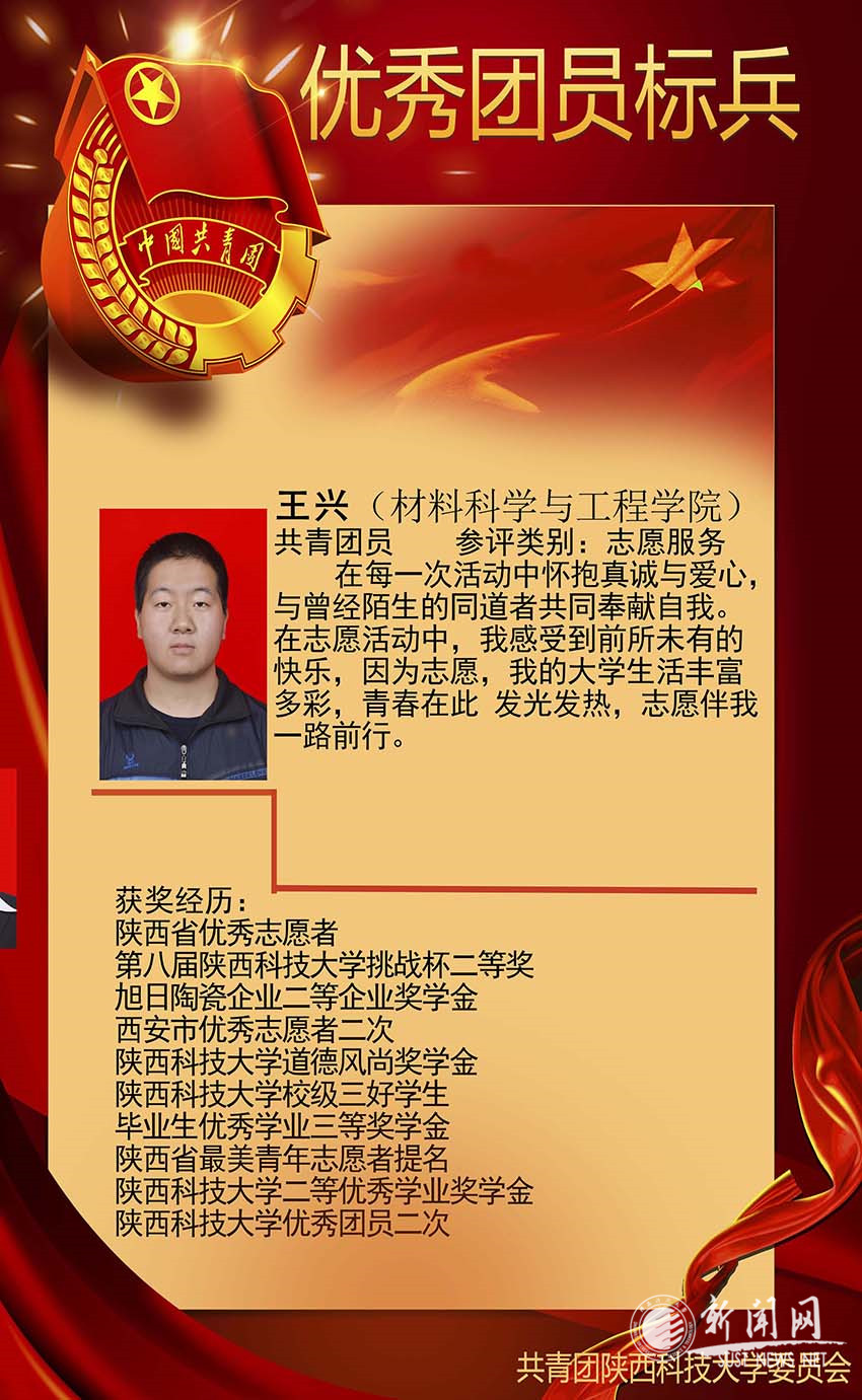 王興,共青團(tuán)員,陜西科技大學(xué)材料學(xué)院材料化學(xué)專(zhuān)業(yè)2012級(jí)學(xué)生。自入校以來(lái),他積極進(jìn)取、自立自強(qiáng)、成長(zhǎng)成才、感恩奉獻(xiàn),在學(xué)習(xí)和志愿服務(wù)方面都取得了良好的成績(jī)。