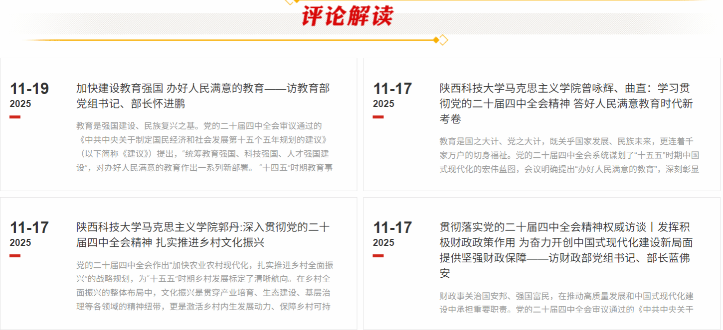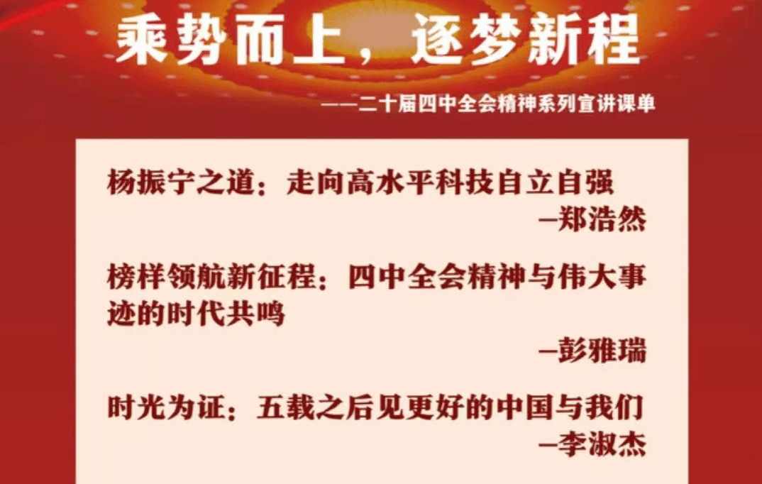 師生闡釋宣講推動(dòng)學(xué)習(xí)宣傳貫徹工作落實(shí)落細(xì)。學(xué)院有重點(diǎn)地組織副高以上教師開(kāi)展理論闡釋,圍繞全會(huì)精神如何更好融入思政課、辦好人民滿意教育、繁榮社會(huì)主義文化、提升中華文明傳播力影響力、扎實(shí)推進(jìn)鄉(xiāng)村全面振興、貫徹投資于人理念、科技創(chuàng)新產(chǎn)業(yè)創(chuàng)新,先后撰寫闡釋類文章十余篇。學(xué)院王飛教授應(yīng)邀為陜西鐵路物流集團(tuán)作黨的二十屆四中全會(huì)精神專題宣講。同時(shí),學(xué)院“紅色基因·薪火傳承”研究生宣講團(tuán)發(fā)布“乘勢(shì)而上,逐夢(mèng)新程——二十屆四中全會(huì)精神系列宣講課單”,組織宣講團(tuán)成員深入校園內(nèi)外,傳播全會(huì)精神,擔(dān)當(dāng)理論宣傳使命。