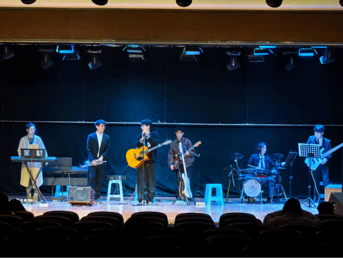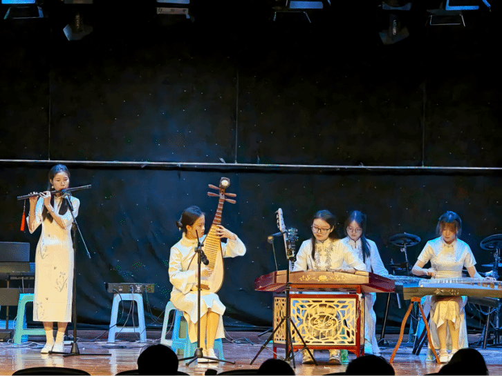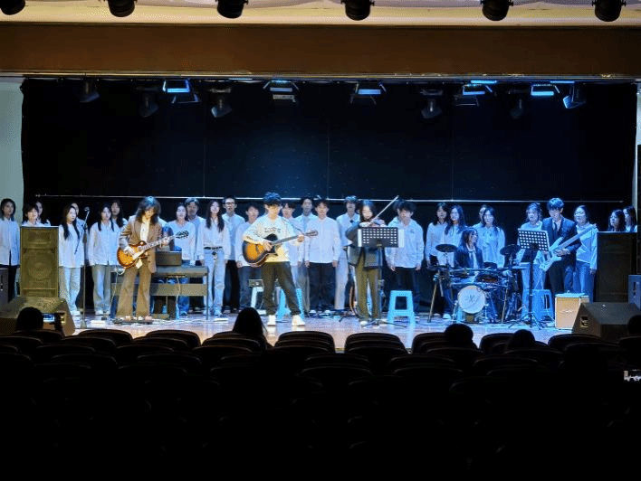 演出現(xiàn)場(chǎng),古箏的悠揚(yáng)、竹笛的清脆與電聲樂器的激昂交織碰撞。民樂協(xié)奏曲《寄明月》以悠揚(yáng)旋律,引發(fā)在場(chǎng)觀眾共鳴;管樂協(xié)奏曲《鋼鐵洪流進(jìn)行曲》氣勢(shì)恢宏,喚起同學(xué)們內(nèi)心力量。2024年被“中國(guó)青年報(bào)”轉(zhuǎn)載的曲目《云宮迅音》再次演繹,傳統(tǒng)民樂與現(xiàn)代電聲器樂的融合,讓現(xiàn)場(chǎng)觀眾沉浸式感受民族音樂與現(xiàn)代音樂碰撞的獨(dú)特魅力;演出尾聲,全體同學(xué)共同演奏《送別》,熟悉的旋律引發(fā)全場(chǎng)大合唱,將活動(dòng)推向高潮。