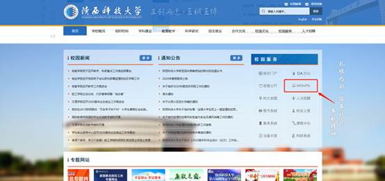 通過我校校園網(wǎng)主頁http://m.768899.cn,下拉至右下方校園服務(wù),點擊WebVPN圖標(biāo)即可。
