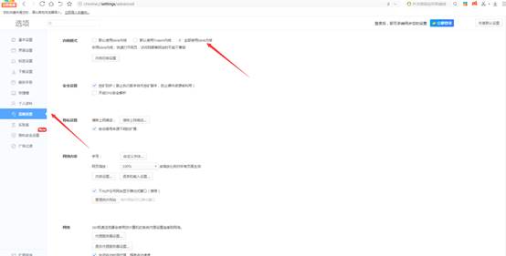 2.在彈出頁面選擇高級設置,在內(nèi)核模式處勾選全部使用blink內(nèi)核,并點擊內(nèi)核切換按鈕