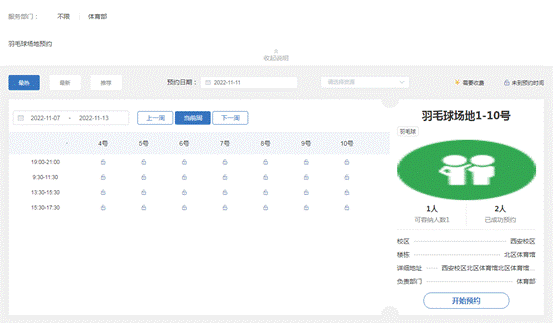 進(jìn)入羽毛球場(chǎng)地預(yù)約服務(wù)后,找到需要使用的場(chǎng)地,根據(jù)需要進(jìn)行預(yù)約即可。
