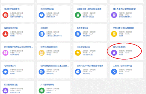 用戶首先登陸陜西科技大學(xué)綜合服務(wù)門戶,然后通過應(yīng)用服務(wù)中的“網(wǎng)上辦事大廳”→“羽毛球球場(chǎng)地預(yù)約”進(jìn)入服務(wù):