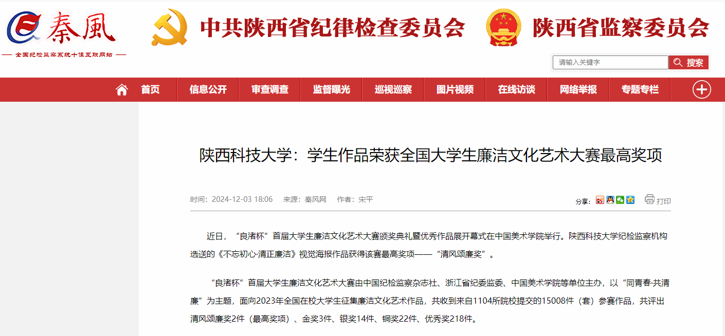 近日,秦風(fēng)網(wǎng)報(bào)道我校學(xué)生作品榮獲全國(guó)大學(xué)生廉潔文化藝術(shù)大賽最高獎(jiǎng)項(xiàng)。