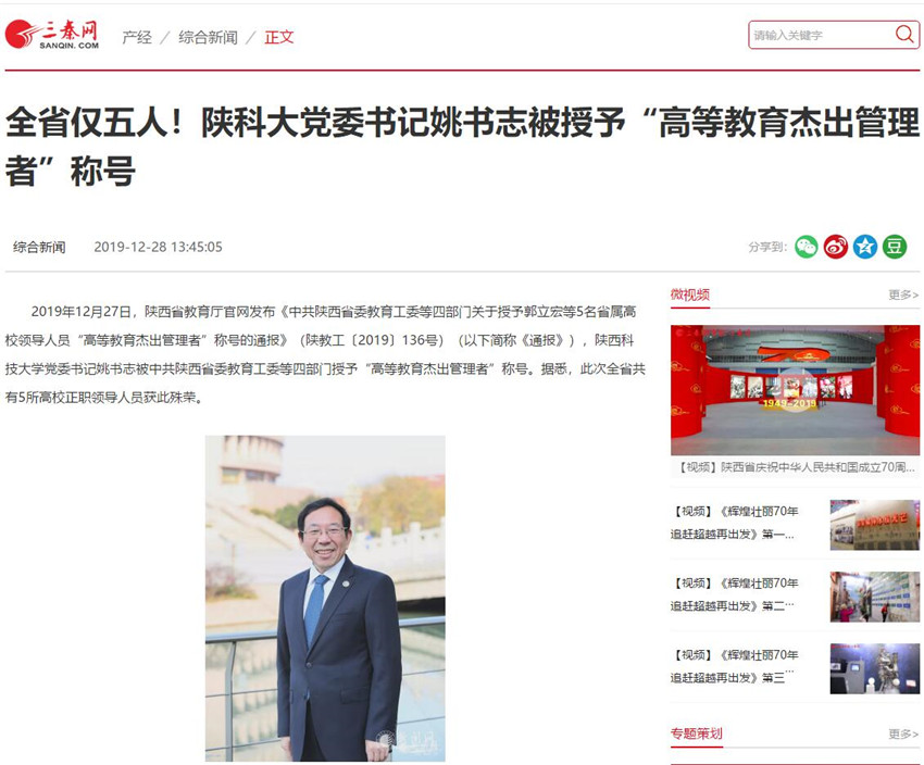 三秦網(wǎng):全省僅五人!陜科大黨委書記姚書志被授予“高等教育杰出管理者”稱號(hào)