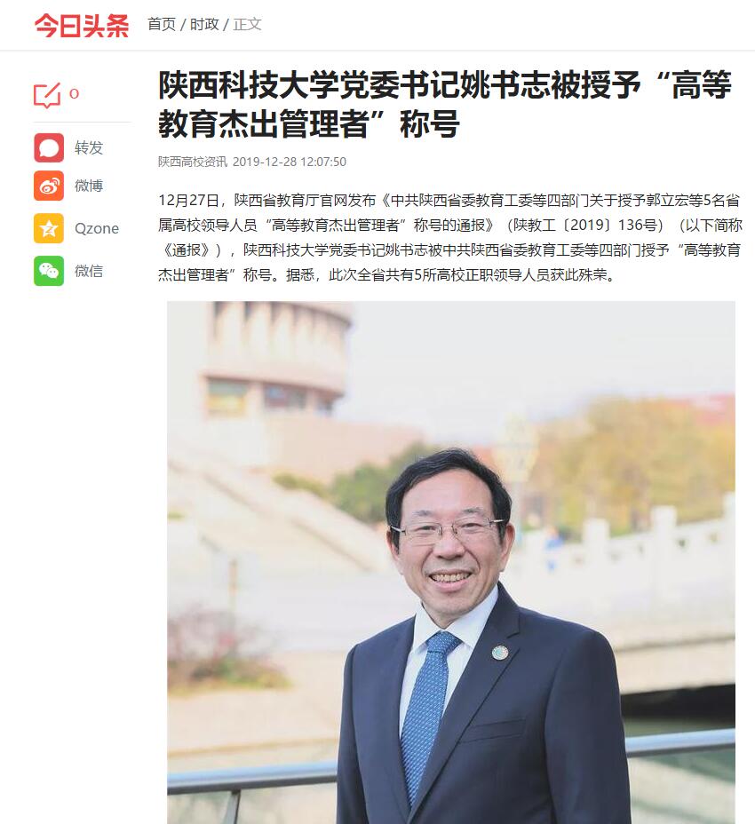 今日頭條APP:陜西科技大學(xué)黨委書記姚書志被授予“高等教育杰出管理者”稱號(hào)