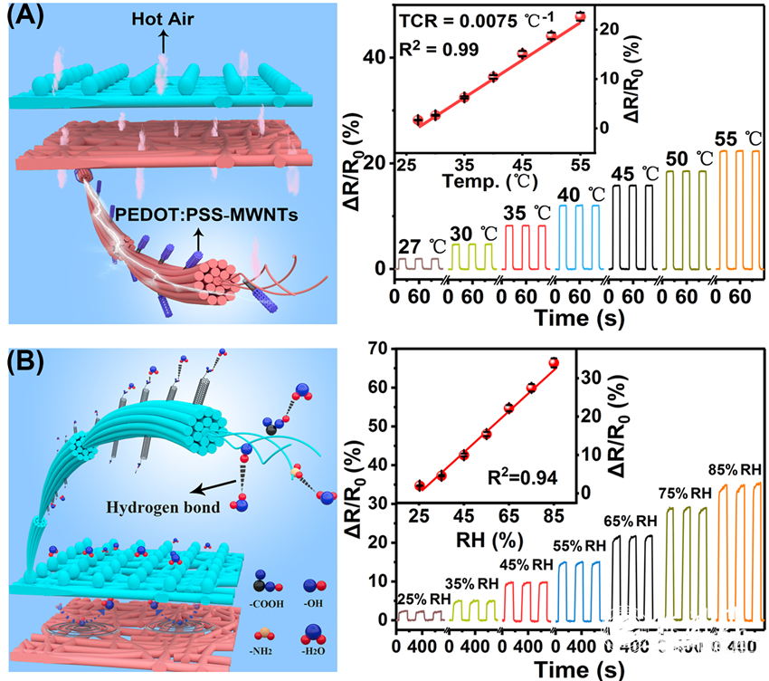王學(xué)川教授領(lǐng)銜的生物質(zhì)與功能材料研究所長期以來一直致力于基于動物生物質(zhì)膠原及其水解物復(fù)合功能材料的研究開發(fā),該論文結(jié)合國家重點(diǎn)發(fā)展的柔性電子智能材料,以膠原基質(zhì)為原料構(gòu)建了多功能柔性傳感材料,為典型的跨學(xué)科交叉技術(shù)應(yīng)用,為擴(kuò)寬我校輕工學(xué)科內(nèi)涵發(fā)展提供支撐。目前,實現(xiàn)柔性傳感器的生物相容性、可穿戴性、高分辨、高靈敏、低成本制造和復(fù)雜信號檢測等功能集成仍是該領(lǐng)域的重大挑戰(zhàn)。本研究以天然皮膠原為結(jié)構(gòu)基板,不同功能屬性的導(dǎo)電材料為物理摻雜導(dǎo)電構(gòu)筑單元,通過靜電紡絲技術(shù)制備雙層仿生全纖維結(jié)構(gòu)的多功能集成電子皮膚。其基于納米摩擦發(fā)電機(jī)理論,兼具自發(fā)電(壓力)、溫度和濕度檢測功能,且具有極高的壓力敏感性和寬檢測范圍、較短的濕度響應(yīng)/恢復(fù)時間、優(yōu)異的電阻溫度系數(shù)。此外,基于低成本、生物相容、透氣性好和可生物降解的優(yōu)勢,使其可廣泛應(yīng)用于智能機(jī)器人、交互式可穿戴設(shè)備和人工義肢等領(lǐng)域。該研究對生物質(zhì)膠原高值資源化及生物相容性功能集成柔性傳感材料發(fā)展具有重要的科學(xué)研究意義和應(yīng)用推廣價值。