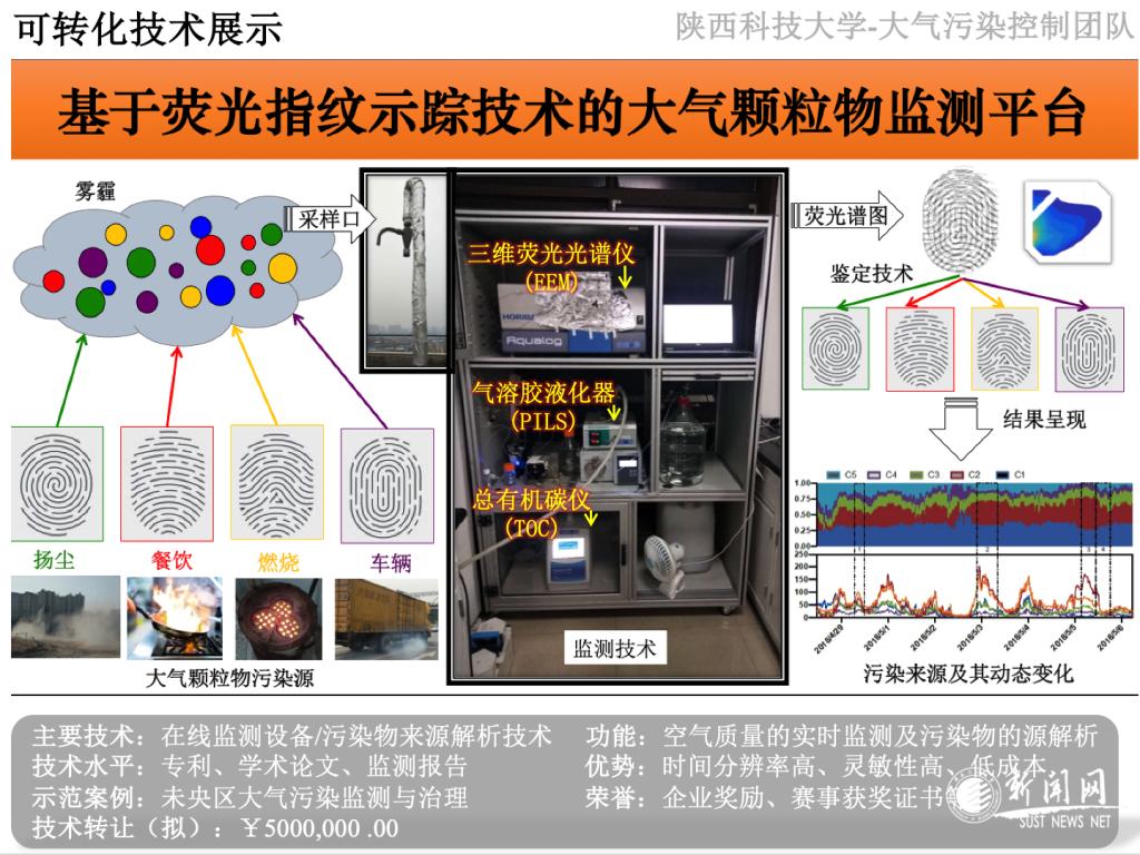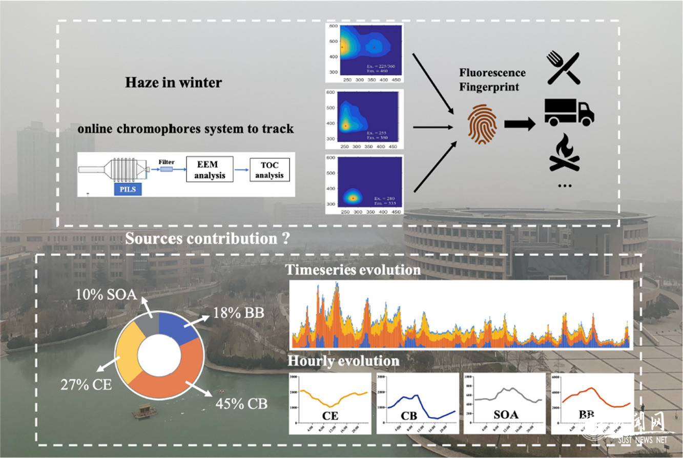 該課題研究歷時三年,得到了國家自然科學(xué)基金項(xiàng)目(41703102、41877354),陜西科技大學(xué)“青年拔尖”啟動經(jīng)費(fèi)等資金支持。主要分為兩方面的工作:一是技術(shù)方面,開發(fā)了基于熒光指紋示蹤的大氣PM2.5化學(xué)組分分析、大氣化學(xué)反應(yīng)機(jī)制探討、大氣污染來源鑒定的技術(shù)方法;二是設(shè)備方面,實(shí)現(xiàn)了大氣PM2.5在線捕獲系統(tǒng)(PILS)與三維熒光光譜(EEM)、總有機(jī)碳分析儀(TOC)的串聯(lián)并用。綜合以上兩方面的技術(shù)和硬件平臺,最終實(shí)現(xiàn)了大氣污染物在線監(jiān)測和來源解析的功能,獲得數(shù)據(jù)可應(yīng)用于精確了解大氣污染物的起源、揭示污染產(chǎn)生和消失機(jī)制,最終服務(wù)區(qū)域大氣污染的治理。團(tuán)隊以陜科大大氣監(jiān)測站點(diǎn)為中心,利用該監(jiān)測設(shè)備已相繼開展了“冬季霧霾形成過程與成因解析”“春季沙塵暴發(fā)生觀測與空氣質(zhì)量影響分析”“夏季大氣污染物化學(xué)反應(yīng)機(jī)制”等具體研究。