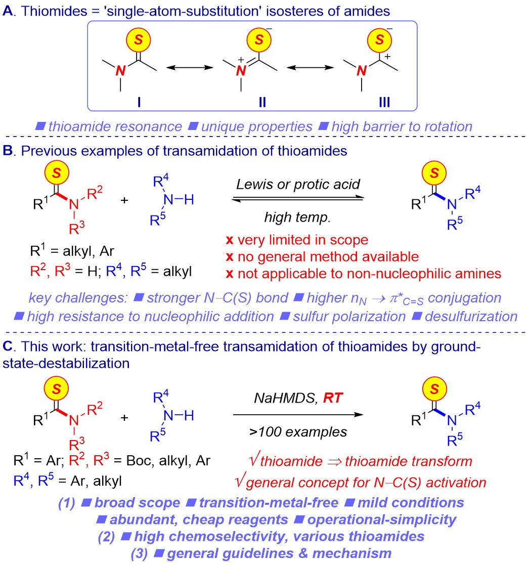 “Chemoselective Transamidation of Thioamides by Transition-Metal-Free N–C(S) Transacylation”首次提出了硫代酰胺的“基態(tài)去穩(wěn)定化”(ground-state-destabilization)策略,實(shí)現(xiàn)了在藥學(xué)、生物學(xué)領(lǐng)域有著廣泛應(yīng)用的硫代酰胺的轉(zhuǎn)胺化反應(yīng)。該方法不僅避免了毒性過渡金屬催化劑的使用,而且有著廣泛的底物適用范圍(>100個底物)。為了進(jìn)一步厘清硫代酰胺轉(zhuǎn)胺化的反應(yīng)機(jī)理,該論文還通過密度泛函理論對反應(yīng)過程進(jìn)行了探討。