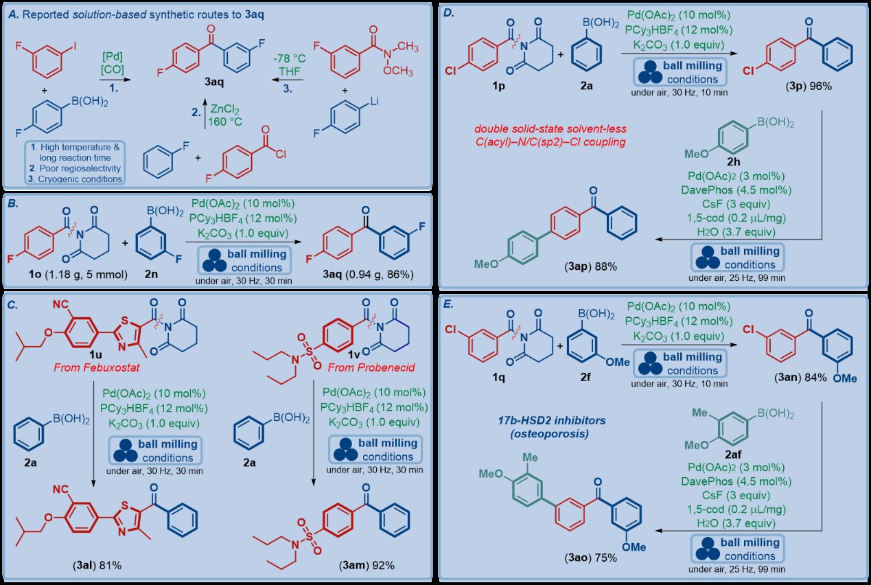 “Mechanochemical Solvent-Free Suzuki–Miyaura Cross-Coupling of Amides via Highly Chemoselective N–C Cleavage首次將機(jī)械化學(xué)方法應(yīng)用于碳氮鍵選擇性斷裂的Suzuki-Miyaura交叉偶聯(lián)反應(yīng)。反應(yīng)過程不需要任何有機(jī)溶劑與額外加熱,后處理簡單,反應(yīng)高效,并可用于醫(yī)藥中間體的合成、復(fù)雜藥物的后期修飾與機(jī)械化學(xué)條件下的串聯(lián)偶聯(lián)反應(yīng)。本研究不僅豐富了酰胺鍵的活化反應(yīng)研究,而且為有機(jī)合成化學(xué)中惰性化學(xué)鍵的活化反應(yīng)提供了新思路。