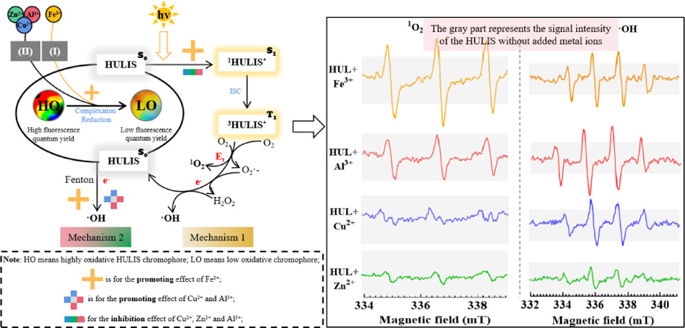 研究指出大氣PM2.5不僅影響人民身體健康,還會(huì)影響全球或區(qū)域性氣候。該項(xiàng)研究發(fā)現(xiàn)西安地區(qū)大氣PM2.5中含有豐富的溫室成分—類腐殖質(zhì)物質(zhì)(HULIS),它在各種微量組分金屬離子(特別是Fe3+離子)的脅迫下可以發(fā)生顯著的光學(xué)特性變化,不僅增強(qiáng)大氣PM2.5對(duì)氣候的增溫效應(yīng),還發(fā)現(xiàn)大氣PM2.5的光化學(xué)反應(yīng)活性也明顯增強(qiáng)了(包括激活三線態(tài)、活性氧自由基反應(yīng)),進(jìn)而影響區(qū)域空氣質(zhì)量。最后,作者圍繞這些發(fā)現(xiàn)提出了分子交互和自由基反應(yīng)機(jī)制,以及潛在的領(lǐng)域影響。