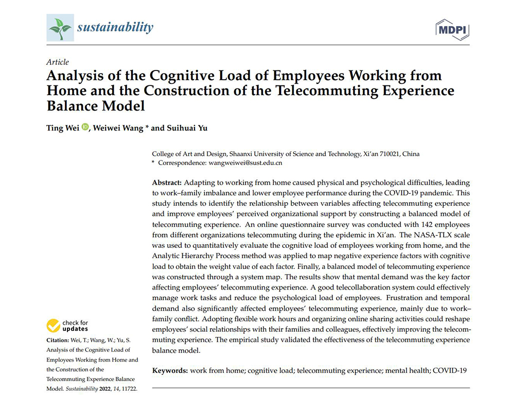 [2] Wei T, Wang W*, Yu S. Analysis of the Cognitive Load of Employees Working from Home and the Construction of the Telecommuting Experience Balance Model. Sustainability. 2022; 14(18):11722.(影響因子3.889)