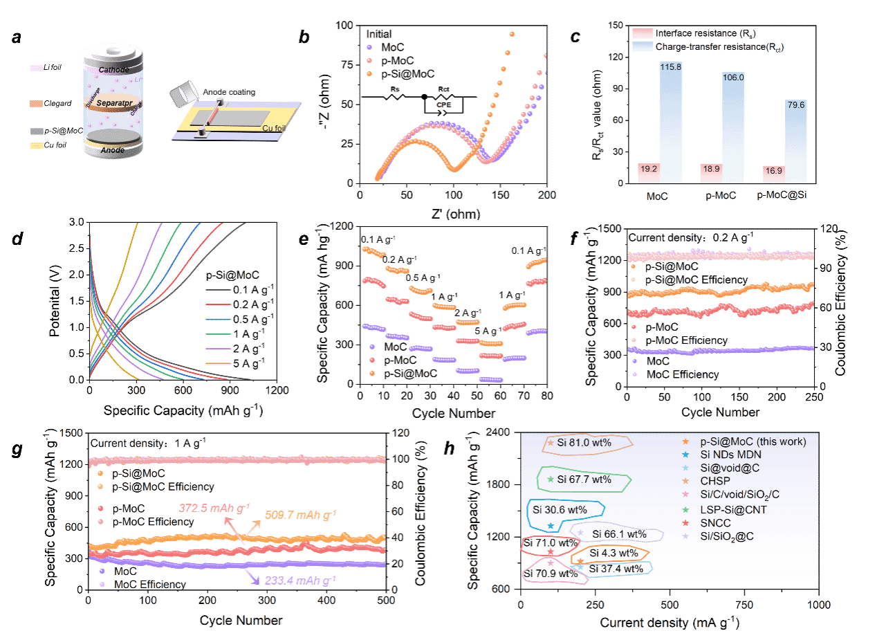 為了進一步評估p-Si@MoC的循環(huán)穩(wěn)定性,在1 A g?1的電流密度下進行500圈次循環(huán)后,p-Si@MoC的可逆容量保持在485.8 mAh g?1,庫侖效率(CE)為98.9%。相比之下,p-MoC和MoC在500次循環(huán)后的放電容量分別為385.1和249.6 mAh g?1。值得注意的是,p-Si@MoC負極的高放電容量歸因于硅的摻雜和基體的多孔結(jié)構(gòu)。與最近報道的不同成分和結(jié)構(gòu)的硅基負極材料相比,p-Si@MoC中硅的含量更低。更重要的是,p-Si@MoC具有優(yōu)異的電化學性能,但仍可與其他硅基陽極相媲美。