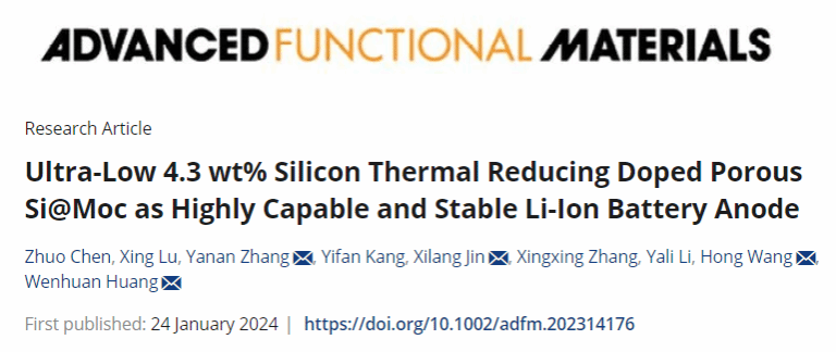 [2] Z. Chen, X. Lu, Y. Zhang,* Y. Kang, X. Jin,* X. Zhang, Y. Li, H. Wang,* and W. Huang*, Ultra-low 4.3 wt% silicon thermal reducing doped porous Si@MoC as highly capable and stable Li-ion battery anode, Advanced Functional Materials, 2024, DOI:10.1002/adfm.202314176.