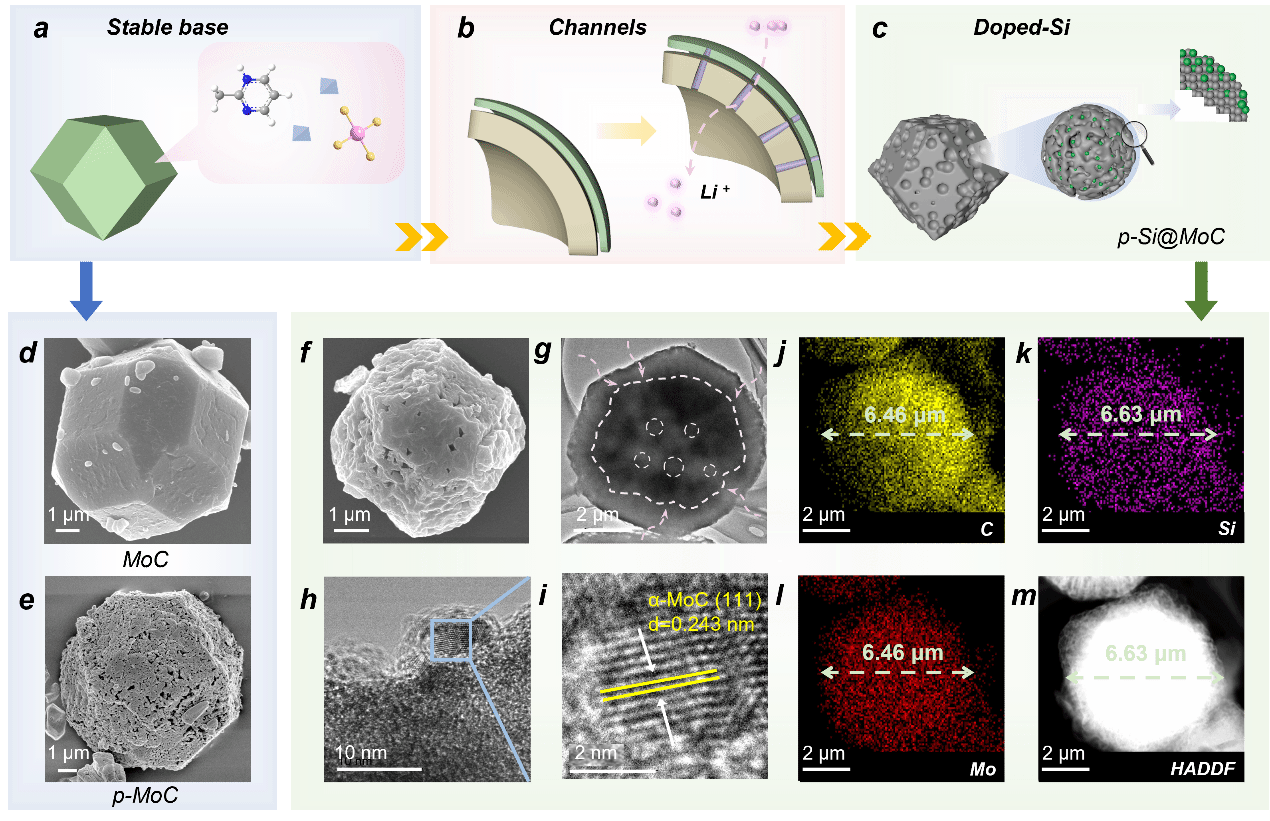 鑒于此,黃文歡教授團隊,采用ZnMo雙金屬雜化沸石咪唑酸鹽框架(HZIF-ZnMo),開發(fā)和設計了一種超低4.3 wt%的硅摻雜多孔MoC材料,并進一步探索了其在高容量鋰離子電池中的潛力(在0.2 A g?1下進行250次循環(huán)后,容量為976.6 mAh g?1)。研究表明,多孔MoC作為基底,不僅為鋰離子的快速擴散提供了連續(xù)的通道,還使超低含量的硅在多孔基體中高度均勻分布,有效誘導硅在循環(huán)過程中實現(xiàn)自身容量的最大利用,研究成果發(fā)表于學術期刊Advanced Functional Materials,題為“Ultra-Low 4.3 wt% Silicon Thermal Reducing Doped Porous Si@MoC as Highly Capable and Stable Li-Ion Battery Anode”