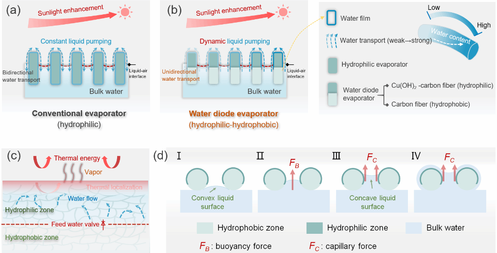 近年來,用于緩解全球水問題的界面太陽能驅(qū)動蒸發(fā)(ISDE)技術(shù)引起了研究者的極大關(guān)注。其中,ISDE系統(tǒng)的供水管理在有效的能量匹配中具有越來越重要的作用。傳統(tǒng)系統(tǒng)中輸入能量和所需能量之間的不匹配嚴(yán)重影響了轉(zhuǎn)換效率。鑒于此,王成兵教授團隊提出并設(shè)計了一種新型的“水二極管”光熱蒸發(fā)器,得益于非對稱表面潤濕性梯度和單向水傳輸特點,該蒸發(fā)器的供水速度可以隨著光強的增加而顯著加快,表現(xiàn)出對光照強度的自適應(yīng)能力。