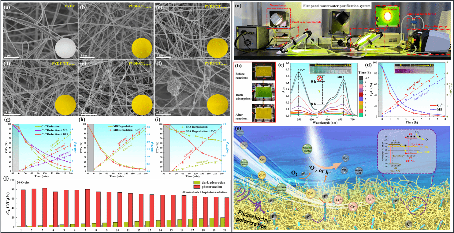 太陽能驅(qū)動(dòng)的廢水凈化技術(shù)是解決水體污染物危害的有效策略。本研究將優(yōu)化的高活性CdS/TiO2異質(zhì)結(jié)與有機(jī)鐵電PVDF復(fù)配,通過靜電紡絲工藝制備出結(jié)構(gòu)穩(wěn)定和可隨意裁剪的復(fù)合光催化薄膜,獲得了高效的Cr(VI)還原與協(xié)同有機(jī)物降解催化活性,可在弱光強(qiáng)(74.1 mW·cm-2)光照下進(jìn)行快速和持久的含鉻廢水凈化處理,免除二次污染的危害。為更好地推動(dòng)光催化技術(shù)在廢水處理方面的實(shí)際應(yīng)用,本研究構(gòu)建了基于該復(fù)合光催化薄膜的平板廢水凈化處理系統(tǒng),實(shí)現(xiàn)了含鉻廢水的有效凈化處理。本研究通過膜材料輔助的平板反應(yīng)技術(shù)為光催化廢水凈化處理提供了新方法。