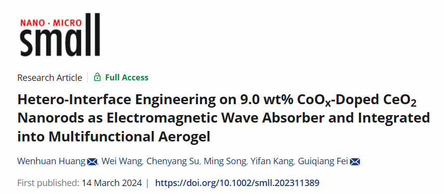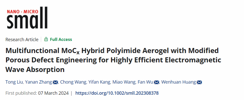 近日,我?;瘜W(xué)與化工學(xué)院黃文歡教授團(tuán)隊圍繞電磁材料微納結(jié)構(gòu)的精確構(gòu)造及性能調(diào)控開展了一系列研究工作,先后在《Small》期刊發(fā)表了兩篇研究論文。分別題為“Multifunctional MoCx Hybrid Polyimide Aerogel with Modified Porous Defect Engineering for Highly Efficient Electromagnetic Wave Absorption”及“Hetero-Interface Engineering on 9.0 wt% CoOx-Doped CeO2 Nanorods as Electromagnetic Wave Absorber and Integrated into Multifunctional Aerogel”。