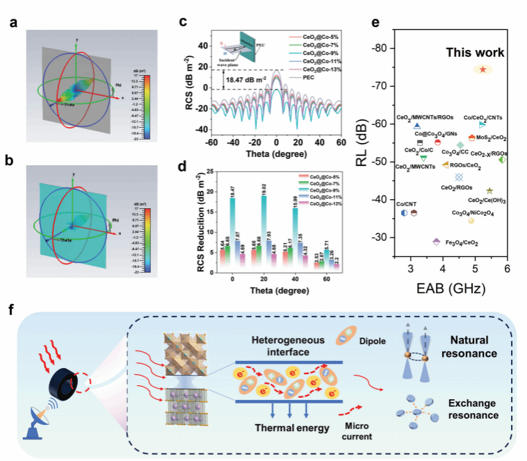 該成果提出了一種簡便的方法,可以大規(guī)模合成具有不同CoOx修飾量的CeO2@Co-x% (x= 5,7,9,11,13)系列電磁波吸收材料(EWAMs)。研究表明,通過調(diào)制摻雜CoOx的比例,在CeO2@Co-9%內(nèi)形成合理的異質(zhì)界面,增強(qiáng)了自然共振和交換共振,提高了磁損耗能力,優(yōu)化了阻抗匹配。通過異質(zhì)界面工程,利用CoOx的摻雜促進(jìn)了CeO2的電荷積累、界面極化和多重散射,增強(qiáng)了材料對電磁波的吸收和衰減,優(yōu)化了阻抗匹配。CeO2@Co-9%材料表現(xiàn)出了最小反射損耗(RLmin)-74.4 dB、優(yōu)異有效吸收帶寬(EAB)為5.26 GHz。