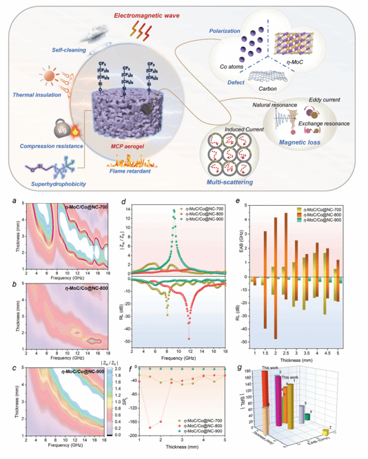成果一:基于多孔缺陷工程設(shè)計的多功能MoCx雜化聚酰亞胺氣凝膠用于高效電磁波吸收