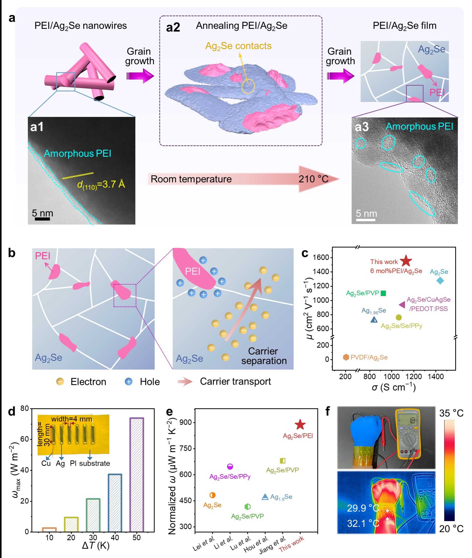 本項(xiàng)工①創(chuàng)新性的提出了一種載流子分離策略用于提升Ag2Se薄膜的電導(dǎo)率和功率因數(shù)。具體地,將絕緣電子供體聚乙烯亞胺(PEI)與Ag2Se復(fù)合, 其中PEI的不均勻分布可以吸引n型Ag2Se基體中的空穴,而分離的少數(shù)載流子基于庫侖斥力能夠避免對n型Ag2Se中電子顯著散射,進(jìn)而優(yōu)化載流子遷移率,實(shí)現(xiàn)了Ag2Se基熱電薄膜創(chuàng)紀(jì)錄的載流子遷移率~1551.99 cm2 V?1 s?1和優(yōu)異的功率因子~22.39 W m?1 K?2;②該復(fù)合薄膜在6 mm彎曲半徑1000次彎曲后電阻僅降低了6.5 %,表現(xiàn)出優(yōu)異的柔性;③該復(fù)合薄膜組裝成的柔性熱電器件表現(xiàn)出優(yōu)異的歸一化功率密度~73.93 W m?2,遠(yuǎn)高于已報(bào)道的Ag2Se基熱電薄膜器件。