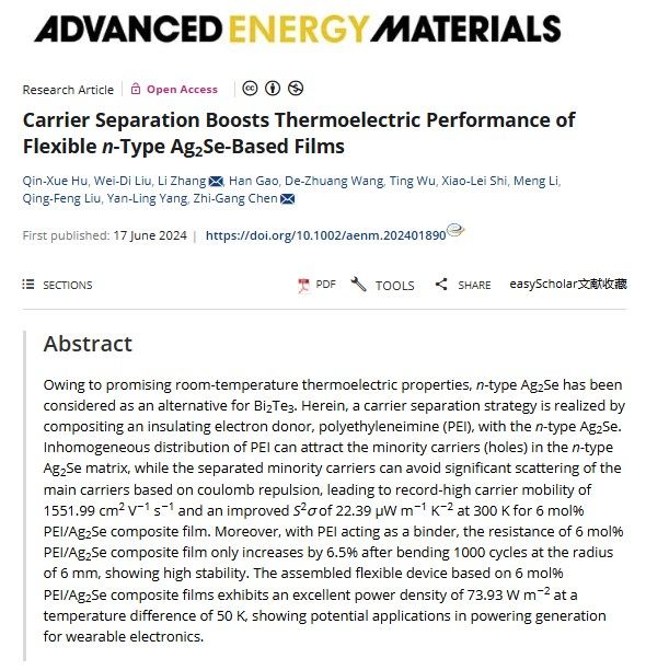 材料科學(xué)與工程學(xué)院(文物保護(hù)科學(xué)與技術(shù)學(xué)院)張荔副教授在Wiley雜志社旗下的國際著名學(xué)術(shù)期刊《Advanced Energy Materials》(IF:27.8)上發(fā)表題為“Carrier Separation Boosts Thermoelectric Performance of Flexible n-type Ag2Se-based Films”的高水平研究論文。我校張荔副教授、昆士蘭科技大學(xué)陳志剛教授為論文共同通訊作者,陜西科技大學(xué)為第一通訊單位。該論文的發(fā)表提高了我校在熱電能源轉(zhuǎn)換材料領(lǐng)域的國際影響力。