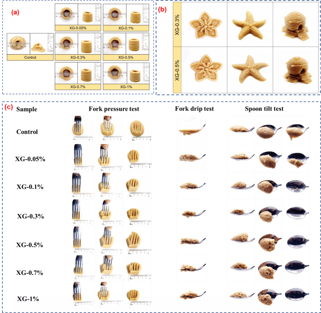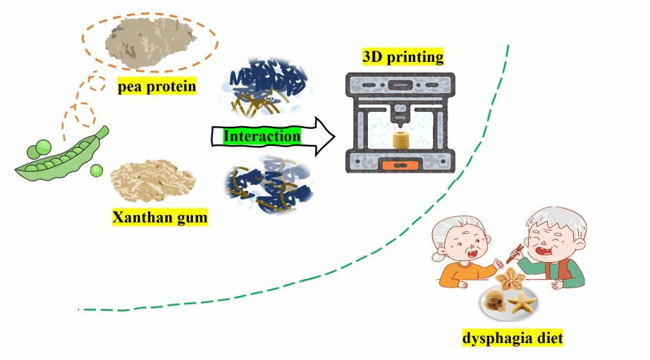 基于此背景,陜西科技大學(xué)食品學(xué)院農(nóng)產(chǎn)品高值加工與安全控制省級創(chuàng)新團(tuán)隊(duì)(莫海珍/胡梁斌教授團(tuán)隊(duì))利用食品3D打印技術(shù),研究不同濃度的黃原膠對豌豆蛋白凝膠理化特性及3D打印品質(zhì)的影響,并采用口腔加工、IDDSI國際吞咽障礙食物標(biāo)準(zhǔn)測試等手段對3D打印樣品的咀嚼吞咽特性進(jìn)行了系統(tǒng)評價(jià)。該工作以“Pea protein-xanthan gum interaction driving the development of 3D printed dysphagia diet”為題于2023年5月發(fā)表在國際著名食品期刊“FOOD HYDROCOLLOIDS”上,獲評ESI高被引論文/ESI熱點(diǎn)論文,并與2024年7月被國家科技圖書文獻(xiàn)中心評為“2023年中國食品科學(xué)技術(shù)領(lǐng)域十大熱點(diǎn)論文”。陜西科技大學(xué)是本論文的唯一通訊單位,食品學(xué)院副教授劉振彬?yàn)樵撜撐牡牡谝蛔髡?,莫海珍教授為該論文的通訊作者。該研究得到國家自然科學(xué)基金委項(xiàng)目的支持。