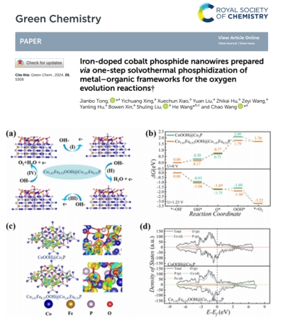 [11] Jianbo Tong, Yichuang Xing, Xuechun Xiao, Yuan Liu, Zhikai Hu, Zeyi Wang, Yanling Hu, Bowen Xin, Shuling Liu, He Wang, Chao Wang. Iron-doped cobalt phosphide nanowires prepared via one-step solvothermal phosphidization of metal–organic frameworks for the oxygen evolution reactions, Green Chemistry, 2024, 26(9): 5308-5325.