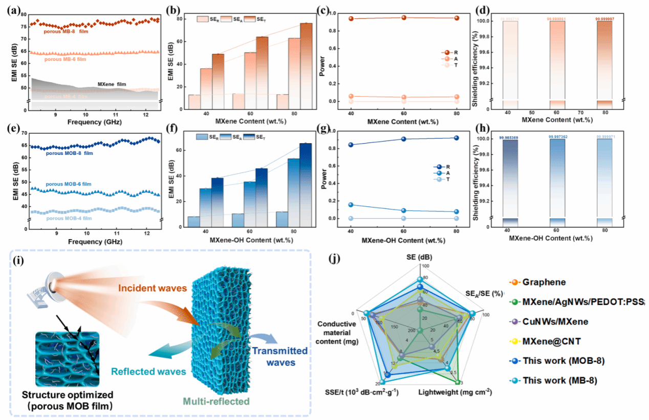 文章亮點(diǎn)如下:通過(guò)離子分子雙交聯(lián)體系和隨后的冷凍干燥工藝,構(gòu)筑了在橫向和垂直方向都具有三維網(wǎng)狀多孔的結(jié)構(gòu),這一獨(dú)特結(jié)構(gòu)極大縮短了離子的傳遞速率,纖維與納米片之間的高度互連性也提高了多孔膜的力學(xué)性能及電磁屏蔽性能;離子交聯(lián)通過(guò)庫(kù)侖吸引調(diào)整MXene片層的方向,同時(shí)優(yōu)化的終端和離子插層擴(kuò)大了層間距;分子交聯(lián)通過(guò)氫鍵相互作用調(diào)整多孔結(jié)構(gòu)的骨架;具有互連性的多孔MXene-OH/BC膜同時(shí)表現(xiàn)出優(yōu)異電化學(xué)性能和電磁屏蔽性能,提供了527 F/g的電容,41.5 MPa的機(jī)械強(qiáng)度,分別為MXene薄膜的140%和367%,并表現(xiàn)出67.2 dB的電磁屏蔽效能。