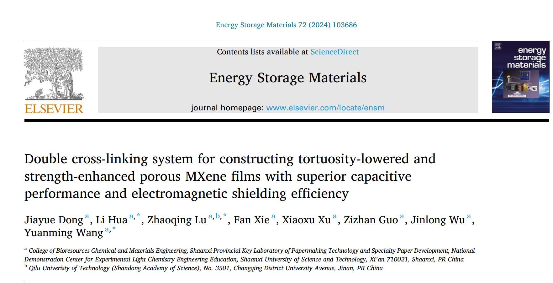 為了解決上述問(wèn)題,陜西科技大學(xué)陸趙情教授團(tuán)隊(duì)通過(guò)離子分子雙交聯(lián)體系設(shè)計(jì)和凍干干燥工藝,構(gòu)建了具有低曲率和高強(qiáng)度的三維結(jié)構(gòu)的柔性多孔MXene薄膜材料。該項(xiàng)工作從材料的的表面終端基團(tuán)、層間距和定向結(jié)構(gòu)角度優(yōu)化了多孔材料的物理化學(xué)性質(zhì),并為制備輕質(zhì)高強(qiáng)的柔性儲(chǔ)能材料和電磁屏蔽材料提供了新思路。相關(guān)工作在《Energy Storage Materials》(IF:18.9)以“Double cross-linking system for constructing tortuosity-lowered and strength-enhanced porous MXene films with superior capacitive performance and electromagnetic shielding efficiency”為題發(fā)表。