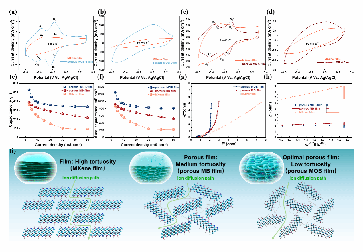 多孔MXene薄膜因其多樣的孔隙結(jié)構(gòu)和豐富的表面化學(xué)性質(zhì),成為理想的柔性電子材料,在柔性儲(chǔ)能、電磁屏蔽等應(yīng)用方面潛力巨大。然而,其典型的問(wèn)題,特別是作為柔性儲(chǔ)能材料時(shí),在高電流密度下,電容性能急劇下降。主要原因在于層間結(jié)合致密,阻礙了離子的動(dòng)態(tài)擴(kuò)散,此外,離子擴(kuò)散路徑的曲率過(guò)高,電荷傳輸過(guò)程緩慢。目前研究者致力于研發(fā)兼具大比表面積、低曲率以及優(yōu)良導(dǎo)電性和機(jī)械性能的多孔MXene薄膜,但仍然面臨諸多挑戰(zhàn)。