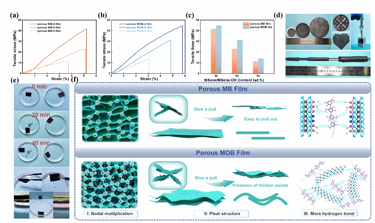 不同比例的分子交聯(lián)與離子分子雙交聯(lián)多孔MXene膜力學(xué)性能及力學(xué)提升機(jī)理圖